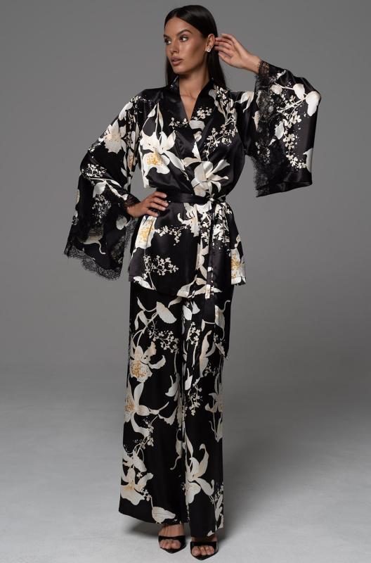 Комплект-тройка Mia-Amore состоит из запашного жакета, топа и брюк-палаццо. Комплект выполнен из принтованного смесового шёлка. Брюки с эластичным поясом и с боковыми карманами. По низу рукава жакета украшены изящным широким кружевом. На спинке у топа вставка из кружева. Жакет комплектуется поясом.