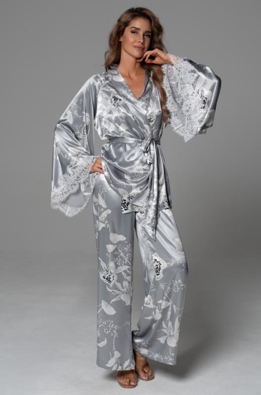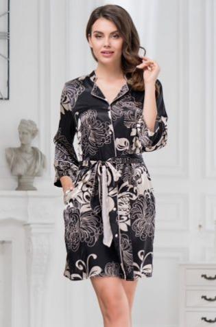 Короткий халат Mia-Mella с рукавами 3-4 выполнен из принтованного искусственного шелкового полотна с атласным блеском. Низ рукавов и борт халата декорированы контрастным кантом. Халат на запахе с поясом, в боковых швах есть карманы.
