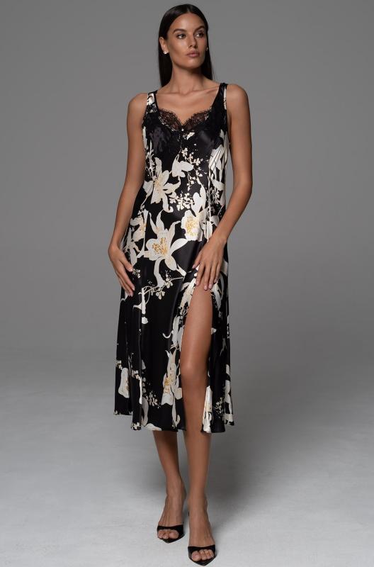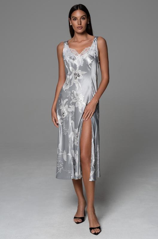 Длинная сорочка Mia-Amore выполнена из смесового принтованного шелка на тонких бретелях без подреза. Боковой разрез сорочки украшен ажурным широким кружевом. На спинке пикантный вырез и кружево. Спереди на лифе бантик с подвеской.