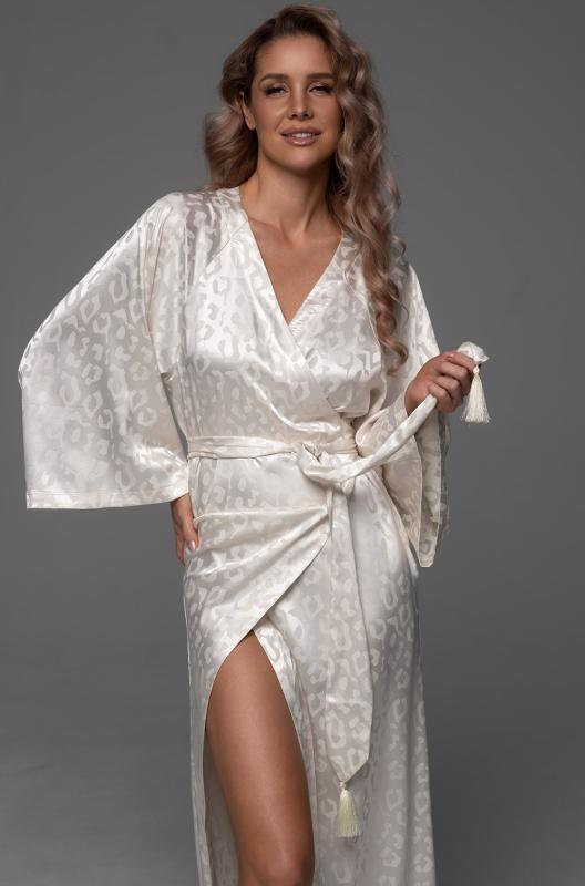 Длинный запашной пеньюар Mia-Amore с широкими длинными рукавами. Изделие выполнено из искусственного шелка на жаккардовой основе. По бокам пеньюара расположены карманы. Полы изделия фиксируются за счет широкого пояса с кисточками.