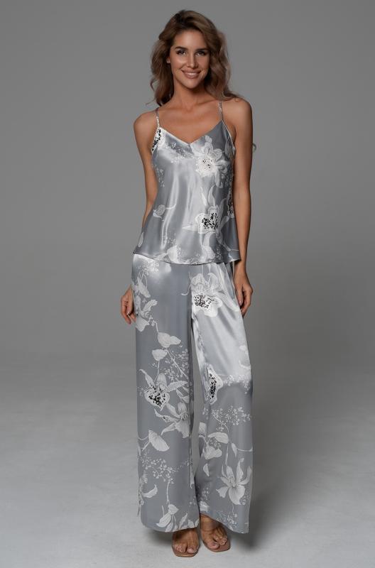 Комплект Mia-Mella рубашка и брюки, выполнен из однотонного искусственного шелка. Рубашка с длинным рукавом с застежкой на пуговицы, узким кружевом обработаны край кармана и низ рукавов. По бокам брюк расположены карманы, а по низу обработаны разрезы.