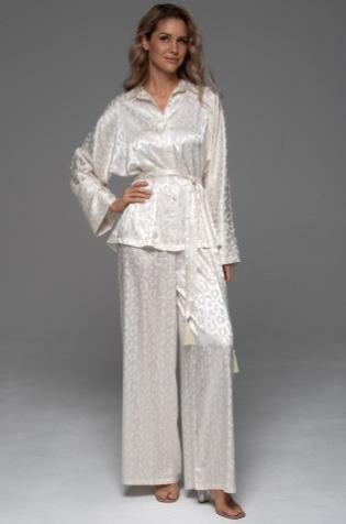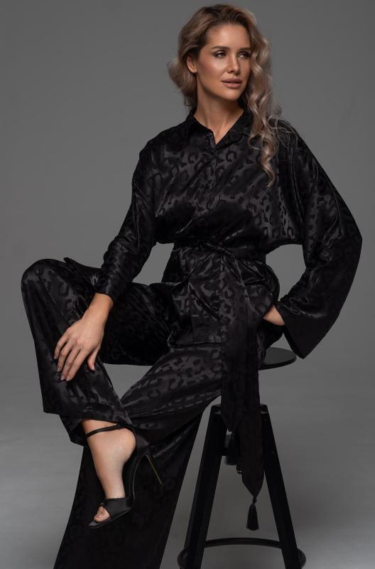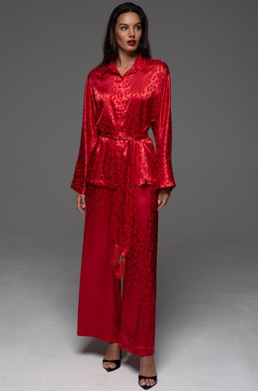 Комплект Mia-Amore состоит из рубашки свободного силуэта с длинным рукавом и широких брюк-палаццо. Изделия комплекта выполнены из искусственного шелка на жаккардовой основе. В комплекте широкий пояс с кисточками.
