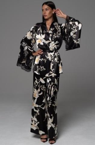 Роскошный короткий халат Mia-Amore с широкими расклешенными рукавами выполнен из принтованного смесового шелкового полотна. Низ рукавов декорирован широкой кружевной полосой. Линию украшают тонкие контрастные канты. Халат на запахе с поясом, в боковых швах есть карманы.