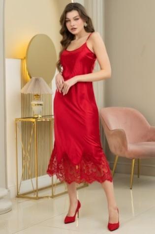 Длинная изящная сорочка Mia-Amore на тонких бретелях без подреза под грудью, выполнена из однотонного искусственного атласного шелка с широкой кружевной частью по низу, и V-образной кружевной вставкой по вырезу сорочки.