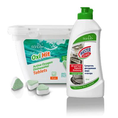 Быстро и без лишних усилий – именно так будет проходить мытье посуды и уборка на кухне с использованием средств TianDe! Таблетки для посудомоечных машин с активным кислородом, природными энзимами и другими натуральными компонентами идеально отмывают посуду, при этом абсолютно безопасны для человека и окружающей среды. Для трудновыводимых и застарелых загрязнений – супергель для удаления жира и нагара.