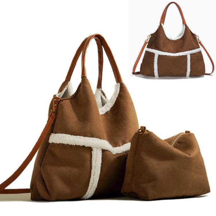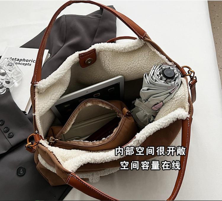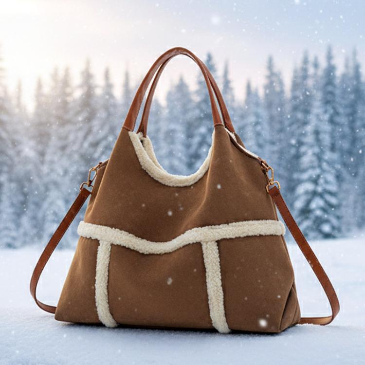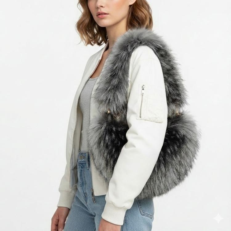 Женская сумка с меховой отделкой Трендовая коричневая сумка с белой меховой отделкой по краям и полностью меховой подкладкой внутри.