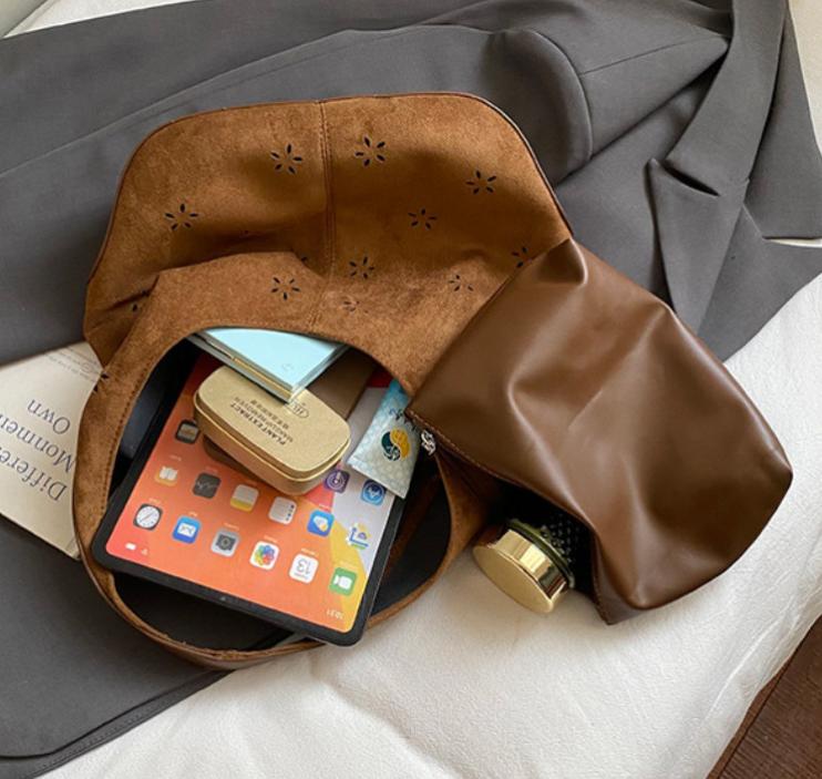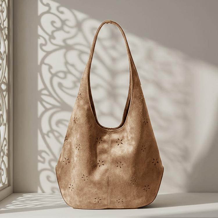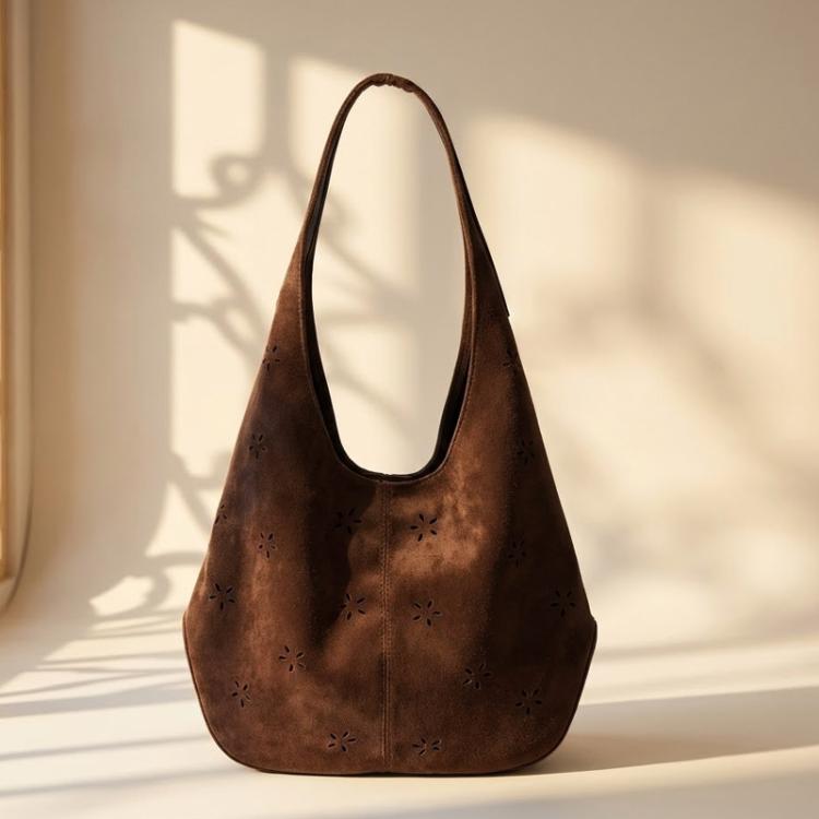 Женская сумка-хобо из замши с отделкой ( дно и верх ручек) из кожи. Коричневая сумка-хобо с лазерной перфорацией в виде цветочков.