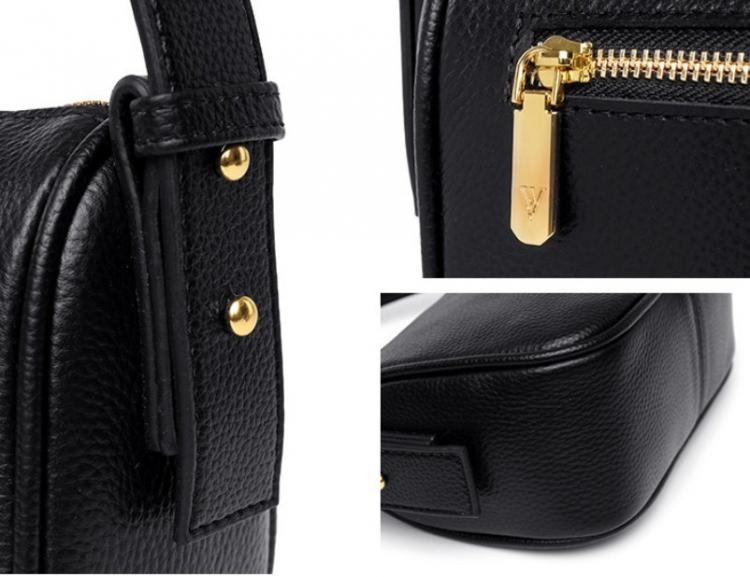 Удобные кожаные ручки, съёмный длинный ремень и дополнительная косметичка в комплекте.