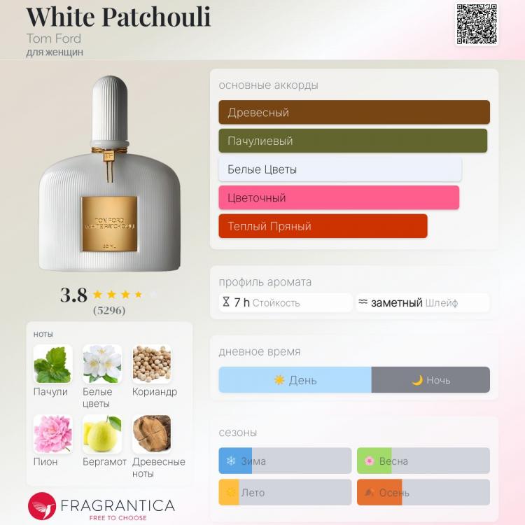 Главная особенность аромата Tom Ford White Patchouli заключается в том, что он презентует главный и один из самых скандальных ингредиентов времен бурных 60-х листья пачули в новом свете, рисуя образ нежного и одновременно чувственного парфюма. Аромат создает образ роскошной и элегантной женщины, смелой и дерзкой, но одновременно трепетной и даже романтичной. Она может быть разной и только с некоторыми людьми осмеливается раскрыть свои истинные чувства. Такая леди - соблазн в чистом виде, потому важнейшим аксессуаром для нее является аромат под стать ее характеру. Аромат ласкает кожу и чувства, он переносит в мир роскоши и благородных нот, которые сливаются воедино и дарят потрясающий вихрь чувств и переживаний. Женщина или девушка с таким ароматом непременно почувствует себя значительно привлекательнее, интереснее, а также станет успешнее, а значит и счастливее. Парфюм словно одевает красавицу в тончайшее полотно из сплетенных нот и в этом изысканном и соблазнительном наряде она не может не блистать и не влю