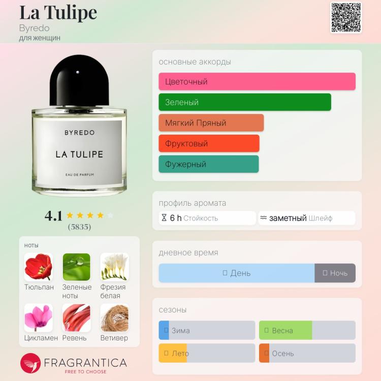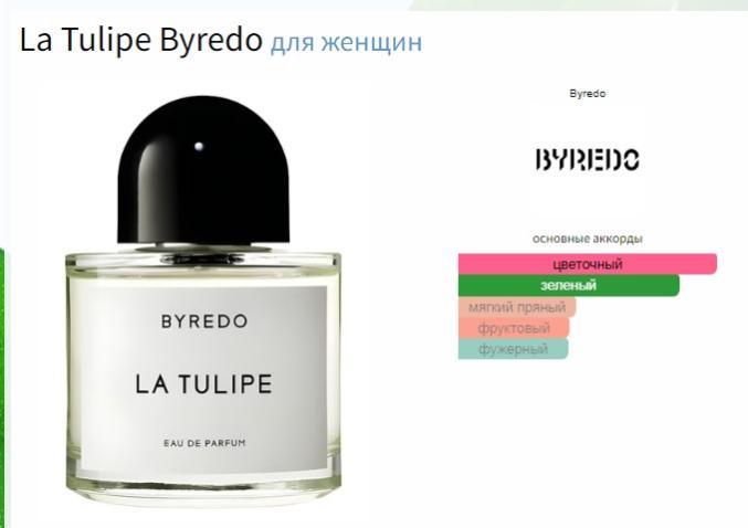 Byredo Parfums La Tulipe можно перевести как Тюльпан и уже одно это во многом определяет его характеристики, которые можно продолжать до бесконечности нежный, чувственный, страстный, романтичный, весенний, легкий, воздушный, будоражащий, запоминающийся и многое-многое другое. Byredo Parfums La Tulipe создавался для женщин в полном смысле этого слова, для тех, кто любит быть яркой и немного своенравной, шикарной и заметной, для тех, у кого есть непревзойденное чувство стиля и вкуса и тех, кто предпочитает исключительно качественную и дорогую парфюмерию. Благодаря аромату Byredo Parfums La Tulipe вокруг каждой женщины буквально за считанные секунды создается совершенно особенная атмосфера, которая в зависимости от конкретной ситуации может расцениваться как романтичная или страстная, а самое главное, что это будет атмосфера, в которой главной будет именно женщина, а не аромат ее духов. Подобно прекрасному тюльпану, который является главной нотой этого аромата, обладательница этого парфюма будет разной в каждое