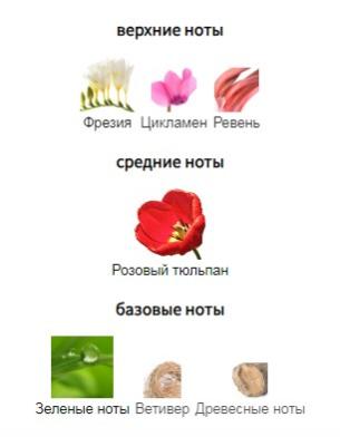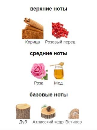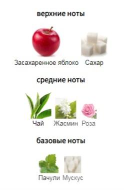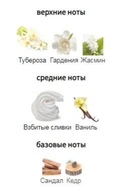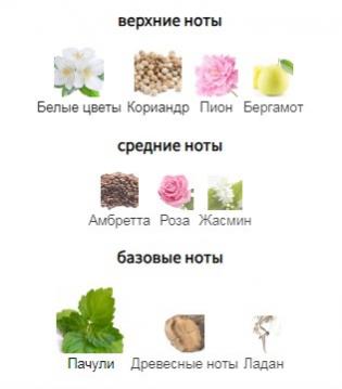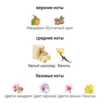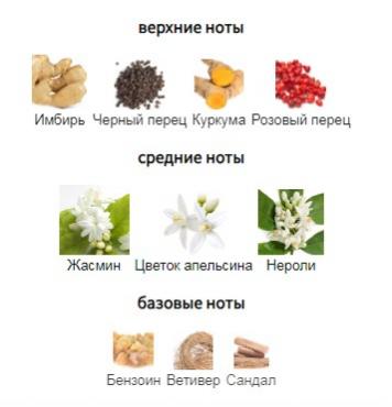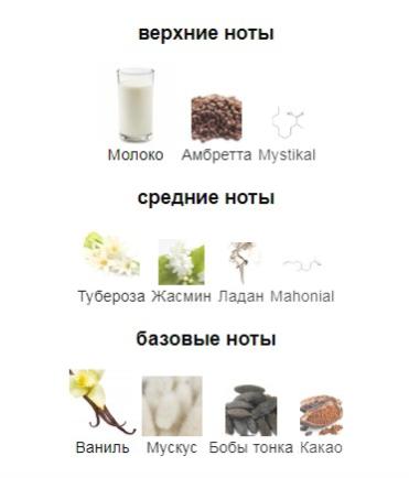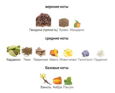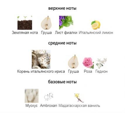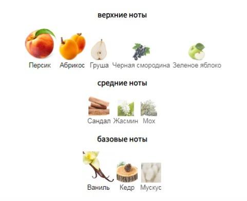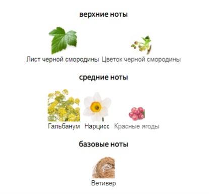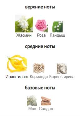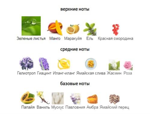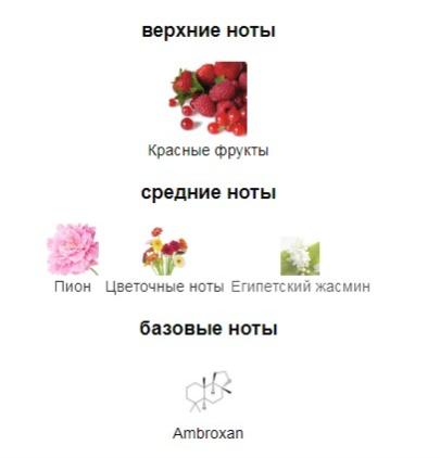 Верхние ноты: маракуйя, персик, малина, лист черной смородины, груша, песок Средние ноты: ландыш Базовые ноты: гелиотроп, сандаловое дерево, ваниль, пачули, мускус