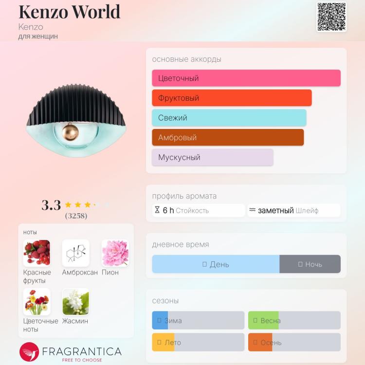 В полном соответствии с данным описанием Kenzo World оказался универсальным, приятным ароматом, не вызывающим противоречивых эмоций. Фруктово-цветочные элементы композиции – это эрзацы: они напоминают не настоящие фрукты и цветы, а лишь их образы. Абстрактный древесно-мускусный фон с металлическим оттенком создаёт чистый, нейтральный аромат, который идеально подходит для насыщенного дня – офиса, тренажерного зала и бара, куда вы с друзьями ненадолго забегаете после работы. На самом деле во многих отзывах люди хвалят данный парфюм именно за эти качества, делающие его универсальным. Естественно, это должно являться стоп-сигналом для истинных ценителей парфюмерии, выискивающих настоящие жемчужины, но всё же следует иметь в виду, что крупные компании всегда стремятся угодить максимально широкой аудитории