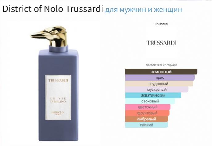 Trussardi District Of Nolo — парфюмерная вода класса люкс с цветочно-фруктовым ароматом для женщин и мужчин, созданная в 2023 году парфюмерной линией итальянского модного бренда Trussardi. Роскошный и эксклюзивный унисекс-парфюм District Of Nolo вдохновлен знаменитой нетривиальной творческой атмосферой Ноло (исторический район рабочих и фабрик) – северного района Лоретто, наполненный независимыми книжными магазинами и модными, а также провокационными, художественными галереями 70 -х годов прошлого столетия.
