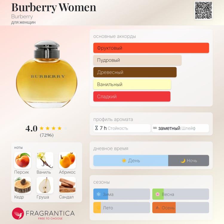 Изящный и свежий, непередаваемо красивый аромат Burberry Women навевает просто восхитительные фантазии. Его можно использовать каждый день или обращаться к нему лишь в особенно торжественных случаях. В первых нотах этой красивой и сложной парфюмерной композиции столько сдержанности! Поведение женщины меняется, ее осанка приобретает горделивую непринужденность, в каждом движении чувствуется аристократизм. Но потом, когда аромат Burberry Women начинает раскрываться, в нем отчетливо слышна особая изысканная дерзость и восхитительная чувственность. Умение удерживать баланс между этими двумя ощущениями составляет основу парфюмерного почерка Burberry. Духи оставляют непередаваемо красивый шлейф, который окутывает свою леди теплым, благоухающим облаком.