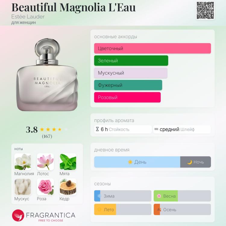 Осмельтесь полюбить этот цветочно-мускусный аромат с нотами пышной магнолии и лаванды, сливочной амбры и сияющего мускуса. Beautiful Magnolia L`Eau — уверенный, чувственный и романтичный. Пусть ваше сердце раскроется, как лепестки магнолии"