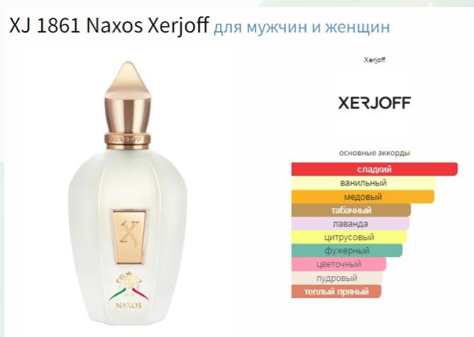 . В верхних нотах цитрусовые оттенки контрастируют с драгоценными специями и пряностями, показывая богатство объединенного государства, славу его завоеваний и господство. Композиция Naxos открывается классическими, воздушными и фруктовыми нотами цитрусов, окруженными мягким и успокаивающим аккордом лаванды. В сердце соединились жасмин самбак, корица, кашмеран и мед, чье романтичное благоухание обогащают мужественные тона табака и бобов тонка, звучащие из базы. Ваниль создает мягкую и чувственную завесу, соприкасаясь с цветами, фруктами и листьями табака.