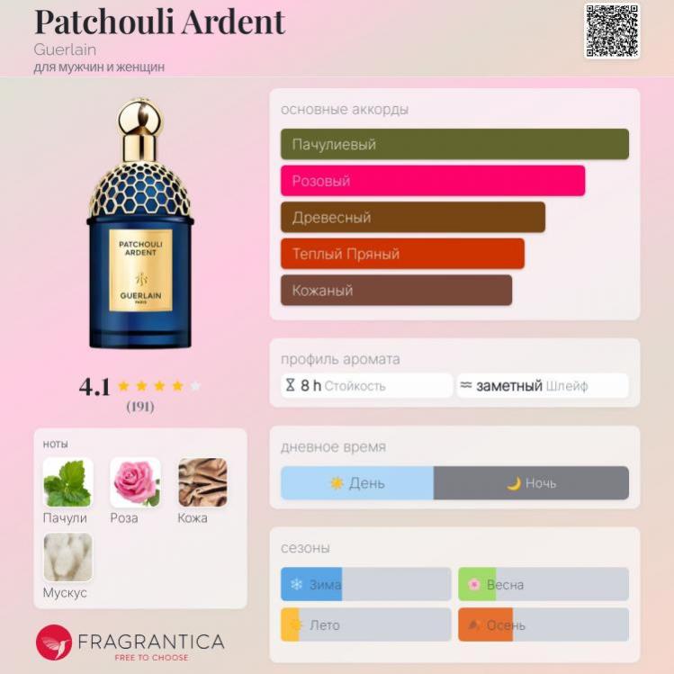 Guerlain Absolus Allegoria Patchouli Ardent - новый аромат-унисекс, предназначенный для женщин и мужчин, выпущенный в 2024 году в рамках коллекции Absolus Allegoria. Он принадлежит к группе древесные кожаные.