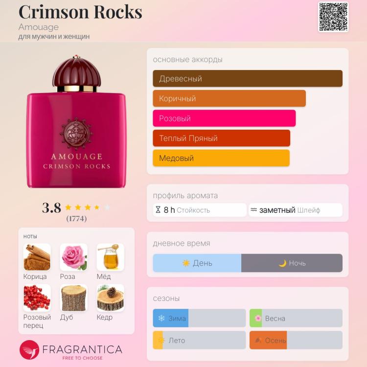 Crimson Rocks — духи, которые мы создавали в три этапа. Идея заключалась в том, чтобы сделать спокойный розовый аромат и с его помощью передать ощущение безмятежности, возникающее в горах Хаджар. Домитиль начала собирать розу, и когда стало понятно, что выходит хорошо, мы задумались о том, какими средствам можно выразить комфорт и спокойствие. Я вспомнил, что в той же местности делают прекрасный мед, и попросил Домитиль добавить медовых нот. В итоге получилось слишком сладко, и мы решили зайти по-другому — со стороны гор, откуда родом наша роза, чего-то более дикого и природного. Так в Crimson Rocks появились пряности и — самый важный элемент — CO2-экстракт дуба производства LMR. Это чудесный душистый материал с глубоким древесным запахом, теплым и немного пудровым."