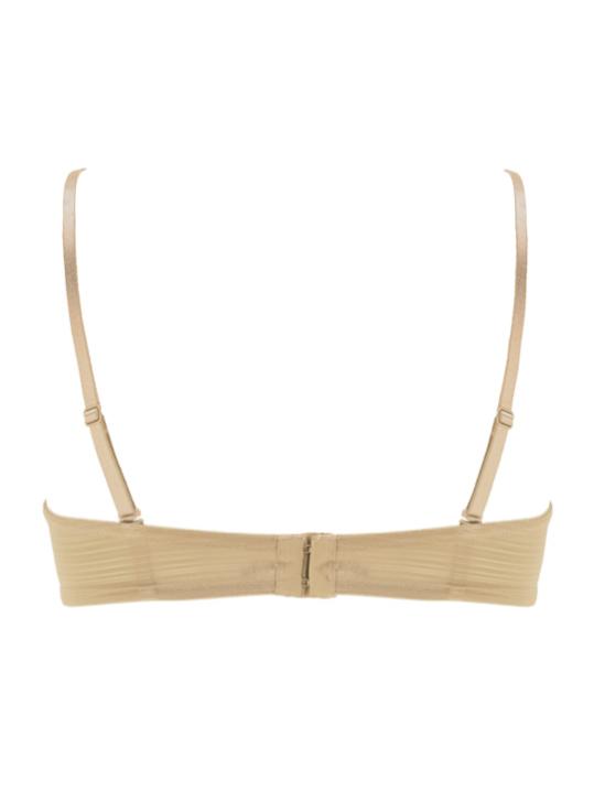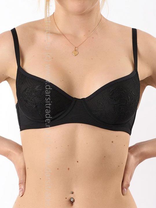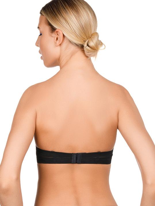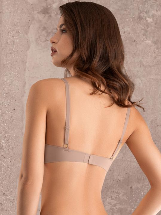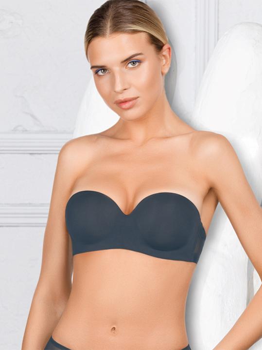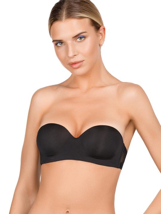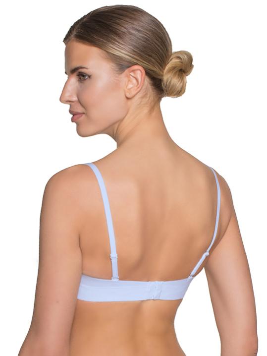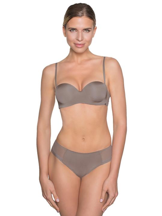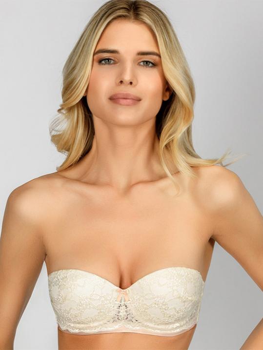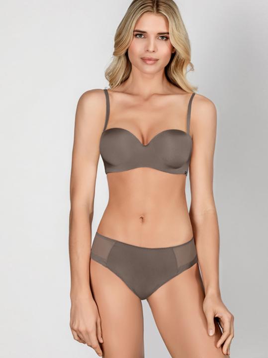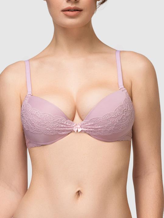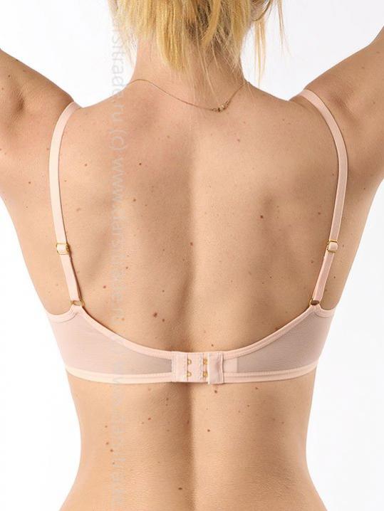 с градуированной чашкой, на косточках. Средний размер пуш-ап. Съемные бретели, широкие резинки на спинке усилены силиконом, что позволяет носить модель без бретелей. Застежка в два ряда на три позиции. Выполнен из микрофибры.Внимание! Старая размерная сетка