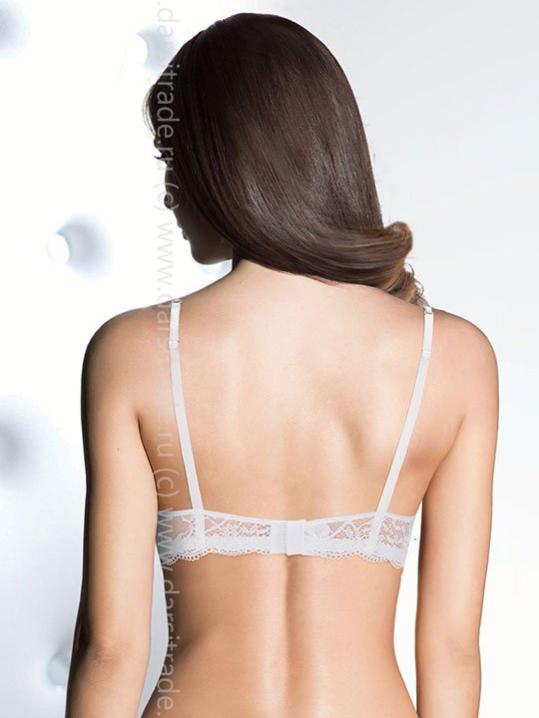 Бюстгальтер с двухслойными мягкими чашками без костей. Съемные формованные вкладыши. Несъемные, регулируемые бретели. Выполнен из микрофибры и кружевной тесьмы. Застежка в два ряда на 3 позиции. Коллекция "
