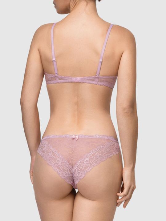 без пуш-ап, на косточках, и трусики-бразильяна с V-образной линией талии. Регулируемые бретели. Застежка в 2 ряда на 4 позиции. Высота бочка трусов 4 см. Выполнен из эластичного, плоского круж