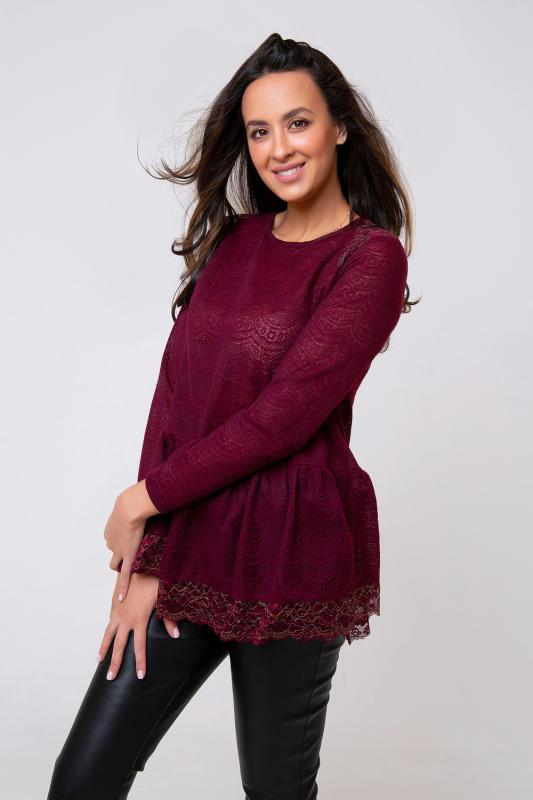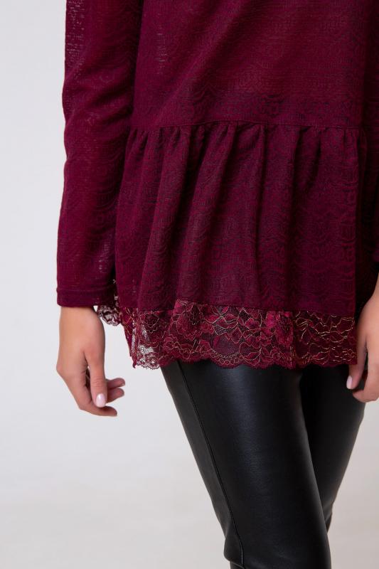 Трикотажная туника-блуза глубокого оттенка, выполнена из полупрозрачного материала. Модель однотонная, оформлена резинкой на талии, а также вставкой из гипюра по краю изделия. Рукав длинный. Горловина округлая. Состав: 75% полиэстер, 20% вискоза 5% эластан. Длина изделия 65 см. Рост модели на фото 173 см (+ каблук).