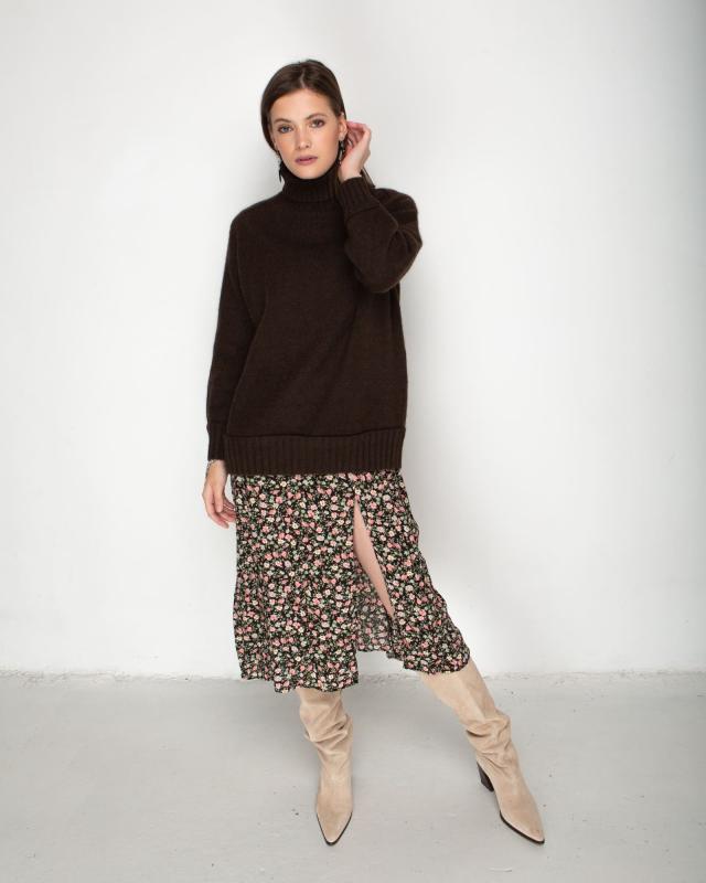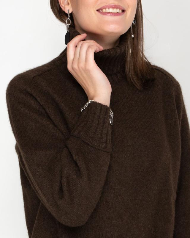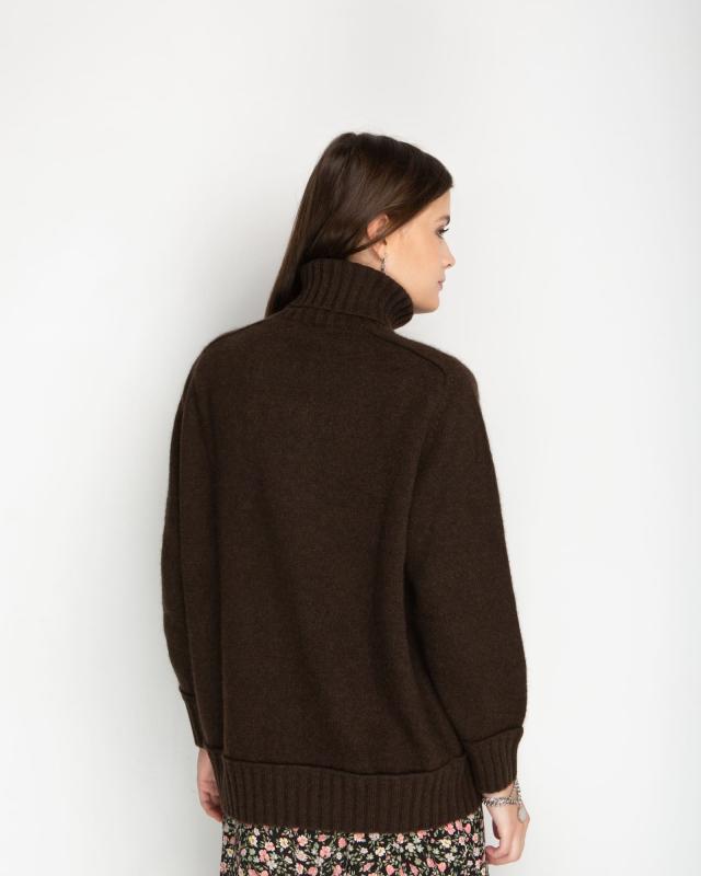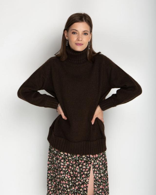 Роскошный универсальный свитер из 100% натурального пуха яка — это сочетание традиционного мастерства и современного дизайна для истинных ценителей природных материалов. Пух яка, собранный вручную в экологически чистых высокогорных регионах, является абсолютным лидером среди натуральных волокон по теплоизоляционным свойствам. Глубокий коричневый оттенок свитера подчеркивает природное происхождение материала и придает изделию благородный вид. Этот универсальный цвет легко интегрируется в любой гардероб и сочетается с одеждой различных стилей — от классического до casual. Натуральный оттенок пуха яка никогда не выходит из моды и всегда выглядит уместно. Удлиненный силуэт с высоким горлом создает не только стильный образ, но и обеспечивает максимальную защиту от холода. Высокий воротник надежно защищает шею от ветра, а удлиненная спинка предотвращает переохлаждение. Свободный крой обеспечивает комфорт при движении и позволяет создавать многослойные образы в холодное время года. Пух яка обладает уникальным компл