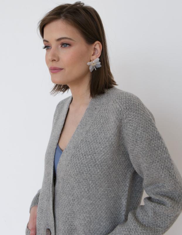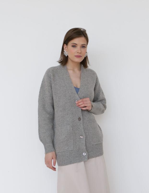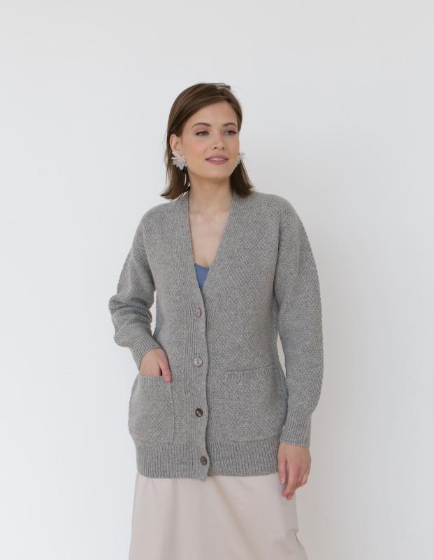 Прямой, свободный крой без утяжеления фигуры. Кардиган удобно носить как в застёгнутом, так и в распахнутом виде, сочетая с юбками, брюками или платьями.