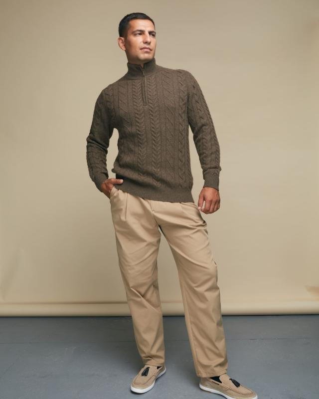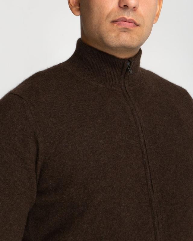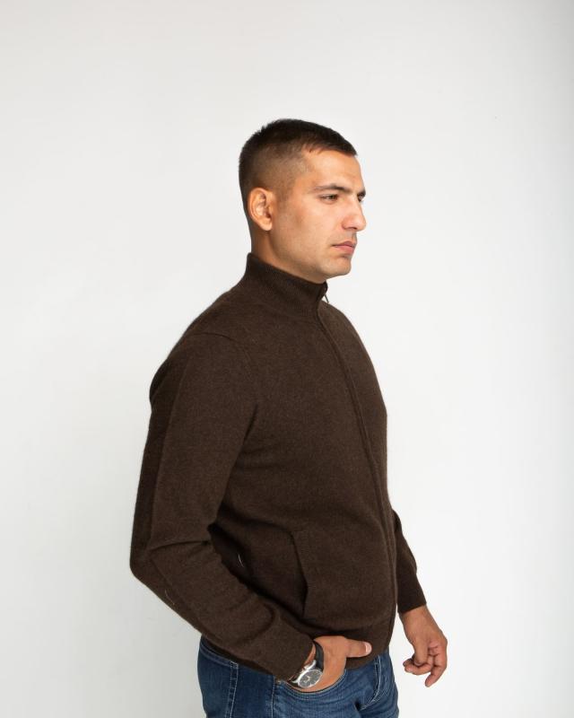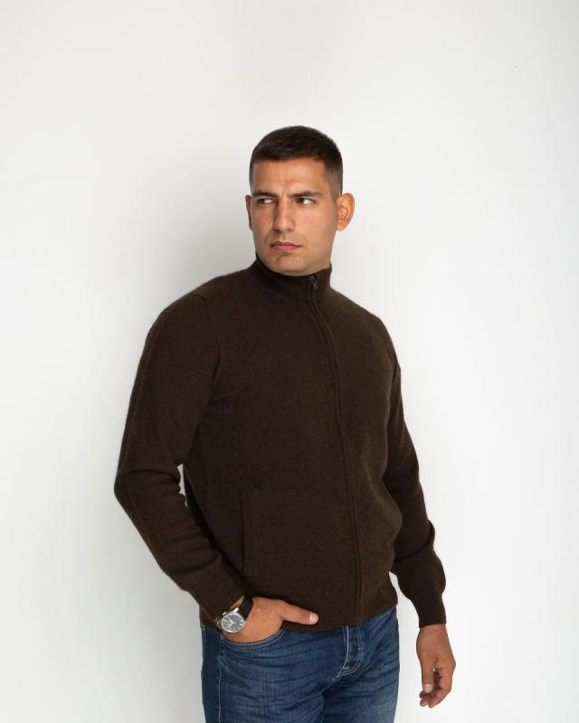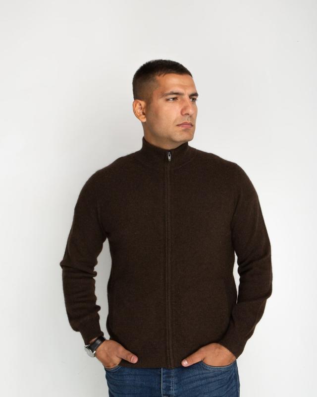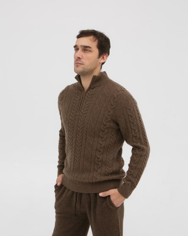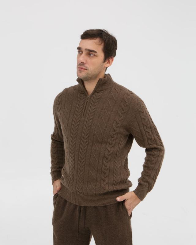 Превосходный мужской джемпер из 100% натурального пуха яка в благородном коричневом цвете – сочетание комфорта и элегантности для современного мужчины. Этот редкий природный материал, добываемый в горных районах Монголии, известен своими исключительными свойствами. Пух яка отличается выдающимися теплоизоляционными качествами – он в 1,5 раза теплее обычной шерсти при значительно меньшем весе. Натуральные волокна создают идеальный микроклимат, сохраняя тепло в холод и обеспечивая комфорт в помещении. Благодаря особой структуре, материал гипоаллергенен и обладает природными антибактериальными свойствами. Элегантный дизайн с воротником на молнии и классическим узором "