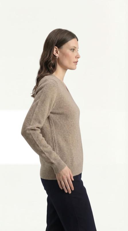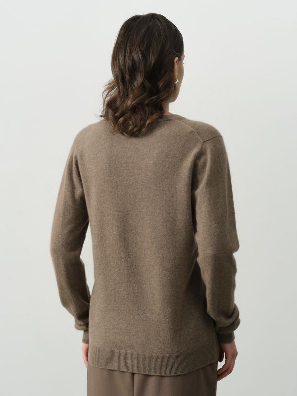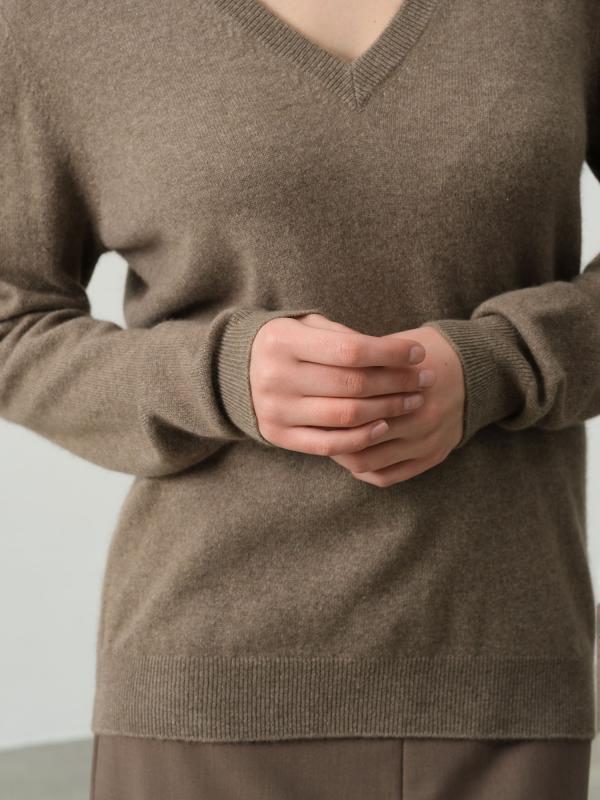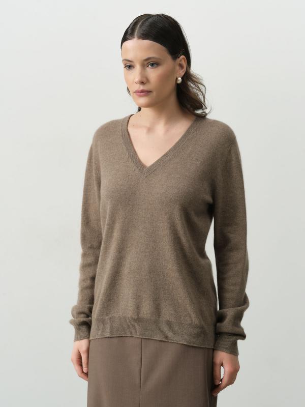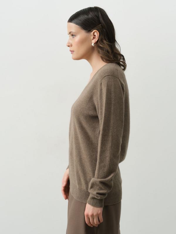 Женский джемпер из кашемира цвета капучино — это сочетание изысканности и комфорта. Мягкий и теплый материал обеспечивает уют и приятные ощущения на коже в течение всего дня. Глубокий V-образный вырез подчеркивает линию шеи и придает образу женственность и элегантность. Универсальный оттенок капучино легко комбинируется с различными элементами гардероба. Отличный выбор для повседневных и офисных образов в прохладное время года.