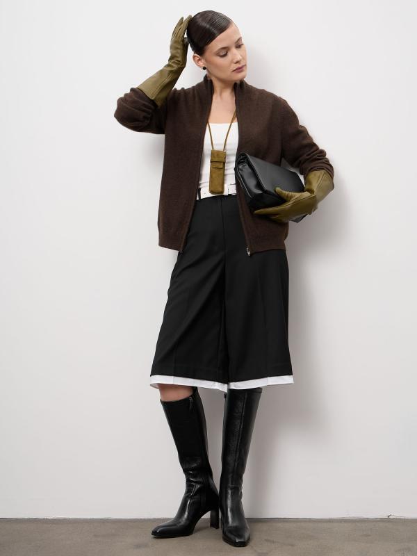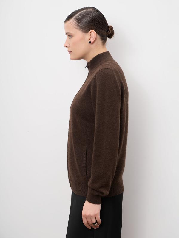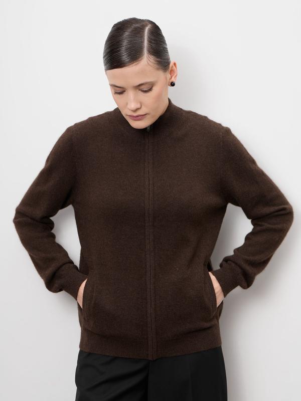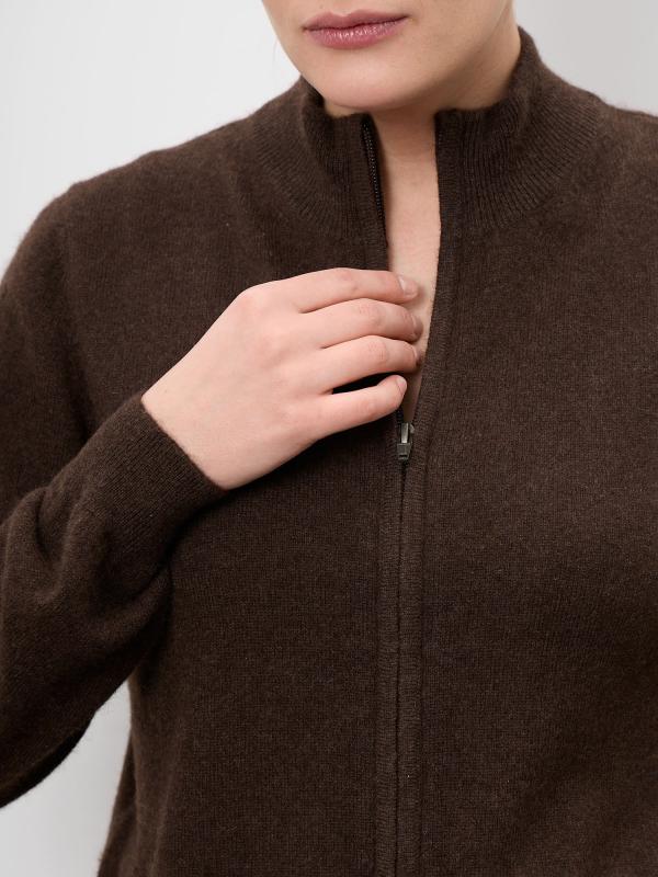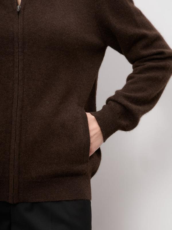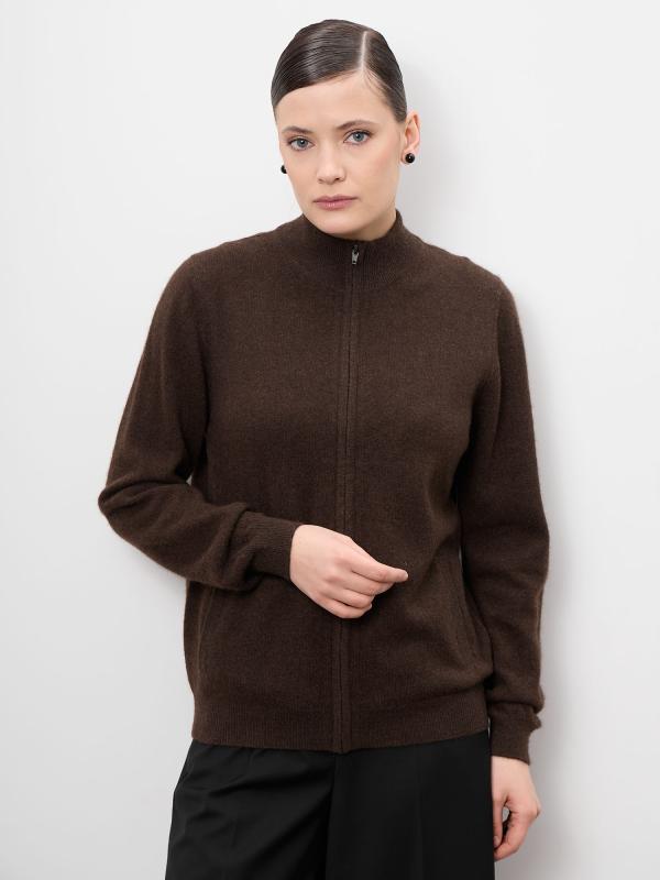 Элегантный женский кардиган из натурального пуха яка в глубоком тёмно-коричневом оттенке. Модель отличается лаконичным дизайном и благородной фактурой, подчёркивающей премиальность материала. Кардиган мягко драпируется, создавая утончённый силуэт, и легко вписывается как в повседневные, так и в более статусные образы.