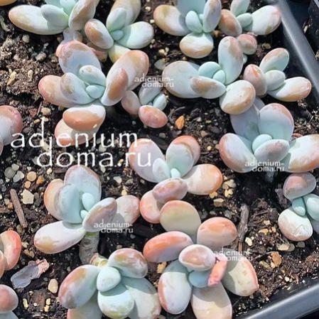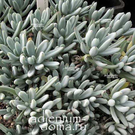 . Пахифитум Каукатеканский - довольно компактное растение. Сочные, толстые листочки, которые величиной и формой бывают схожи со сплющенной виноградиной вытянутой формы, окрашенной в светлый зеленовато-сизый оттенок и имеющей на по