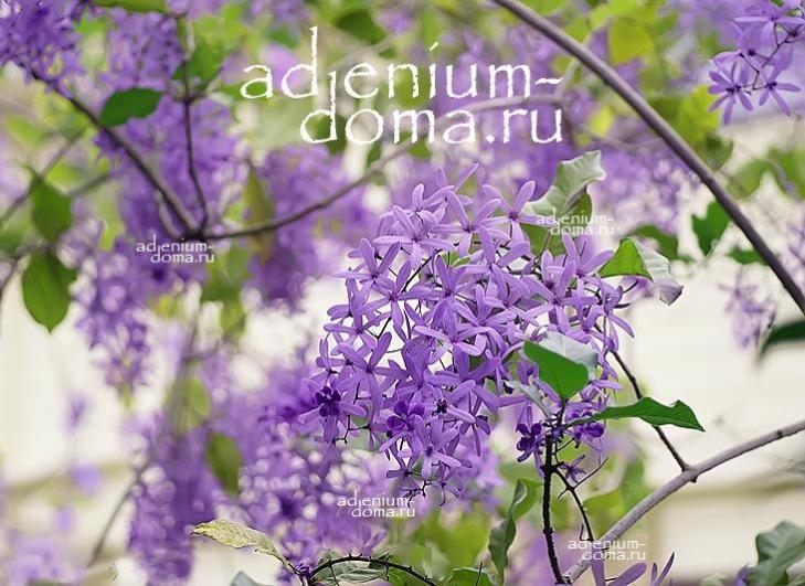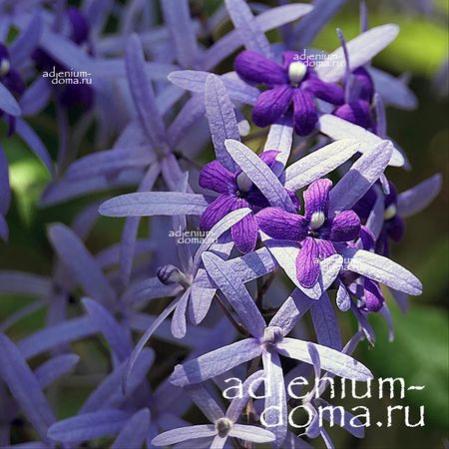 Petrea VOLUBILIS – Петрея вьющаяся, Петрея Волюбилис, Пурпурный венок, Венок королевы, Наждачная лоза. Описание: Петрея - род экзотических двудольных цветковых растений семейства Вербеновые. Ареалом произрастания выступает Мексика и Бразилия. В дикой природе, представители рода встречаются в тропических, влажных лесах и лесополосах. Экзотические растения напоминают лианы, вьющиеся кустарники. Лиственная масса расположена супротивно или спиралевидно. Поверхность листьев кожистая, шершавая, насыщенно-зеленая. Цветки находятся в соцветиях-кистях. Они расположены на концах веток, реже – в лиственных пазухах. Прицветник мелких размеров, или их нет вовсе. Чашечка выраженная, крупнее венчика, бывает синего, сиреневого или серого цвета. Ягодовидный плод содержит 2 семена, иногда недоразвитый, с 1 семечком. Петрея вьющаяся представляет собой быстрорастущую вечнозеленую древесную лиану, достигающую до 10 м в длину. Плотные кожистые листья ярко-зеленого цвета эллиптической формы вырастают до 10-20 см. Они покрыты мелки