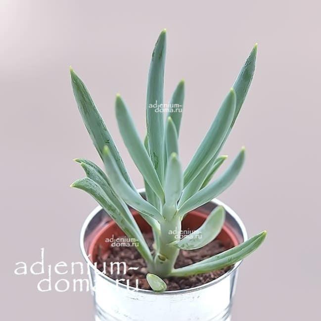 листочки, постепенно опадающие у основания стебля, нарастают очень плотно в спиральном порядке, и формируют плотную розетку. Листовые пластины, покрытые белесым восковым налетом с серебристым отливом, имеют серовато-белую, зеленую, сизую окраску, из-за чего растение называют "
