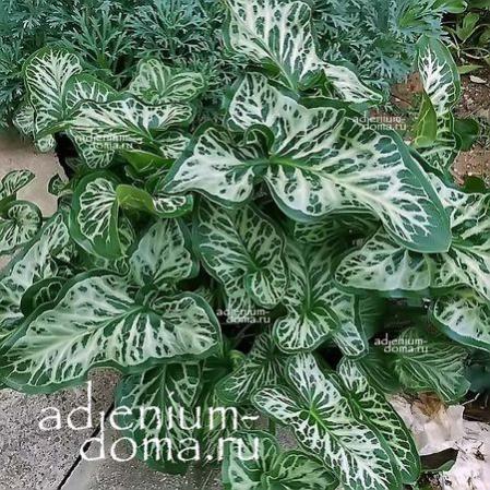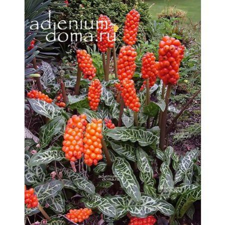 . Описание: Аронник, известный также как Арум, - род многолетних травянистых растений семейства Ароидные, включающий около 25 видов, широко распространенных в лесах и на горных склонах южной Европы, северной Африки, передней и средней Азии. Представителей также можно встретить в некоторых частях Великобритании и Ирландии. Небольшие многолетние травы до 1 метра в высоту с полушаровидными или яйцевидными горизонтальными клубневидными корневищами. Представители характерны крупными стреловидными листьями и впечатляющими соцветиями-початками, обычно имеющими покрывала необычной формы различных ярких окрасок. Цветки однополые, околоцветник отсутствует. Мужской цветок состоит из 3-4 тычинок, расположенных группами. Женский цветок источает капельку нектара во время цветения. Все виды содержат токсичные алкалоиды и могут вызвать раздражение при контакте с кожей или при попадании в рот. Аронник итальянский мраморн