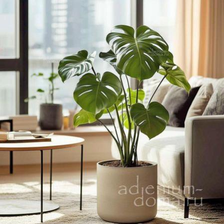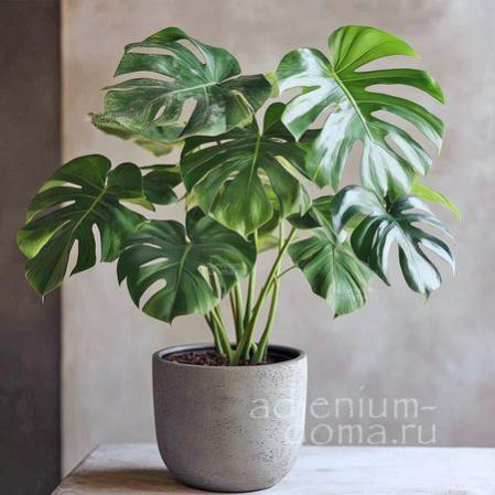 Monstera DELICIOSA - Монстера деликатесная, Монстера изысканная, Swiss Cheese Plant, Mexican Breadfruit, Ceriman. Описание: Монстера – род декоративных лиан семейства Ароидные, включающий около 50 видов, распространённых во влажных тропических лесах Центральной и Южной Америки. Эти растения встречаются в подлеске, где используют стволы деревьев как опору для подъёма к свету. Представители рода отличаются мощными ползучими стеблями с воздушными корнями и крупными листьями с характерными разрезами или отверстиями. Листья кожистые, сердцевидные или овальные, у молодых растений цельные, с возрастом становятся рассечёнными. Цветки собраны в початок с покрывалом, плоды у некоторых видов съедобные. Цветение в культуре редкое, обычно наблюдается только в оранжереях или в условиях тропического климата. Плодоношение возможно, плоды у съедобных видов напоминают початки кукурузы, имеют сладкий вкус. Монстера деликатесная – крупная лиана, способная достигать в природе 10–15 м длины, а в комнатных условиях вырастает до 3–