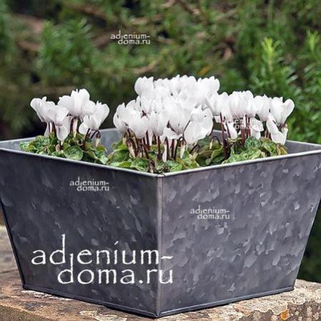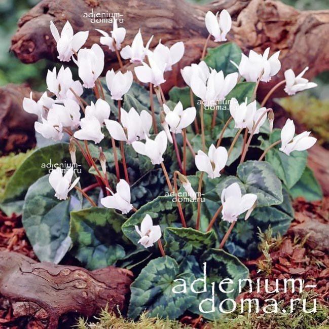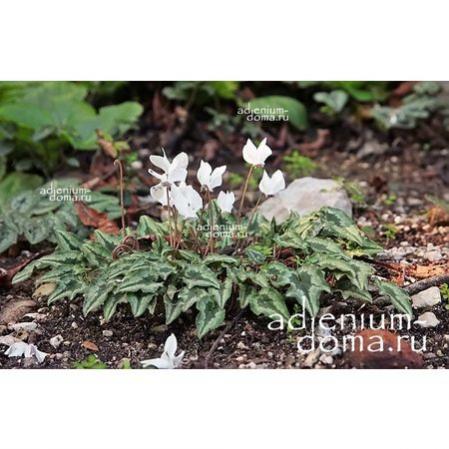 - Цикламен плющелистный белоцветковый, Cyclamen NEAPOLITANUM, Цикламен неаполитанский, Альпийская фиалка. Описание: Цикламен - род многолетних травянистых растений семейства Первоцветные, объединяющий от 20 до 55 видов, в естественной среде произрастающих в Средиземноморье, центральной Европе, северо-восточной Африке и Малой Азии. В России произрастает в городах Геленджик, Сочи, в Туапсинском и Горячеключевском районах Краснодарского края. Растение состоит из подземного толстого клубневидного корня, короткого подземного стебля и надземных сердцевидных, яйцевидных или почковидных листьев. Растущие от корня зеленые листовые пластины имеют длинные черешки, в некоторых случаях их украшает рисунок серебристого оттенка. На высоких цветоносах (около 30 см) формируются одиночные поникающие цветки, скручивающиеся спирально после цветения. Цветок правильный, с колокольчатой, пятираздельной чашечкой и пятираздельным венчиком, белым, розовым или пурпурным. Цветение наблюдаетс