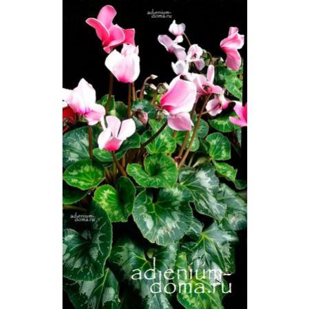 , Альпийская фиалка, Дряква. Описание: Цикламен - род многолетних травянистых растений семейства Первоцветные, объединяющий от 20 до 55 видов, в естественной среде произрастающих в Средиземноморье, центральной Европе, северо-восточной Африке и Малой Азии. В России произрастает в городах Геленджик, Сочи, в Туапсинском и Горячеключевском районах Краснодарского края. Растение состоит из подземного толстого клубневидного корня, короткого подземного стебля и надземных сердцевидных, яйцевидных или почковидных листьев. Растущие от корня зеленые листовые пластины имеют длинные черешки, в некоторых случаях их украшает рисунок серебристого оттенка. На высоких цветоносах (около 30 см) формируются одиночные поникающие цветки, скручивающиеся спирально после цветения. Цветок правильный, с колокольчатой, пятираздельной чашечкой и пятираздельным венчиком, белым, розовым или пурпурным. Цветение наблюдается зимой либо весной, в зависимости от вида