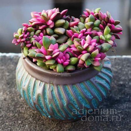 Anacampseros TELEPHIASTRUM Variegata - Анакампсерос телефиевидный пестрый, Анакампсерос Телефиаструм Вариегата. Описание: Анакемпсерос - род небольших суккулентных растений семейства Портулаковые, включающий около 30 видов, распространённых преимущественно в Южной Африке. Наибольшее видовое разнообразие отмечается в засушливых районах ЮАР и Намибии, где растения встречаются среди каменистых осыпей, в трещинах скал и на солнечных сухих равнинах. Представители рода характеризуются плотными стеблями, способными образовывать компактные подушки или розетки. Листья небольшие, мясистые, гладкие или слегка опушённые, с выраженной способностью накапливать влагу в засушливые периоды. Многие виды проявляют яркую окраску под воздействием солнца, переходящую от зелёных до розоватых и пурпурных оттенков. Цветки обычно одиночные, розовые, белые или светло фиолетовые, раскрывающиеся в тёплое время суток. Они продолжают цвести вплоть до вечера, издавая лёгкий сладковатый аромат. Плоды представляют собой коробочки с очень мел