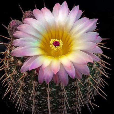 Eriosyce TENEBRICA - Эриосице теневая, Эриозице Тенебрика, Thelocephala. Описание: Эриосице — род кактусовых растений семейства Кактусовые, включающий около 30 видов, распространённых в засушливых районах Чили и Аргентины. Эти растения приспособлены к экстремальным условиям — палящему солнцу, скудным осадкам и значительным перепадам температуры между днём и ночью. В природе многие виды обитают на каменистых склонах и в трещинах скал, где накопление влаги минимально. Представители рода имеют шаровидную или цилиндрическую форму стебля диаметром 4–12 см, с 13–21 плотным рёбром, разделённым на сжатые складки. Ареолы покрыты густым войлочным опушением, из которых выходят многочисленные колючки — от белых до серых, желтоватых или бурых, прямых, изогнутых либо скрученных. Радиальных колючек обычно 15–40 длиной до 6 см, центральных — 4–20, более мощных. Поверхность стебля матовая, серовато-зелёная, буроватая или с пурпурным оттенком. Корневая система часто реповидная, утолщённая и шишковатая, что помогает запасать в