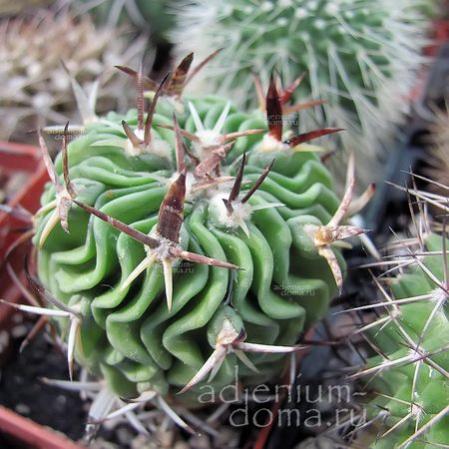 Stenocactus VAUPELIANUS - Стенокактус Ваупеля, Эхинофоссулокактус Ваупелианус, Echinofossulocactus. Описание: Стенокактус - род кактусов семейства Кактусовые, включающий около 10 видов, распространённых в засушливых районах центральной и северной Мексики. В природе встречается на каменистых известняковых почвах и часто растёт среди колючих кустарников, что защищает от прямого поедания животными. Род представлен растениями с компактными шаровидными или слегка цилиндрическими стеблями с многочисленными узкими, высокими волнистыми и сильно гофрированными рёбрами, которые увеличивают поверхность стебля для лучшего поглощения солнечного света и позволяют растению сжиматься при засухе. Эти рёбра создают эффект '