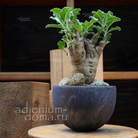 Pterodiscus MAKATINIENSIS - Птеродискус макатинийский, Птеродискус Макатиниенсис. Описание: Птеродискус — небольшой род каудексных растений семейства Подорожниковые, распространённый в засушливых районах Южной и Восточной Африки. Представители рода отличаются массивными, часто дискообразными или шаровидными каудексами, служащими резервуаром влаги на период длительной засухи. Надземные побеги развиваются сезонно, обычно в тёплое время года, и могут быть как прямостоячими, так и раскидистыми. Листья большинства видов опушённые, мясистые, с волнистыми краями, располагаются преимущественно в верхней части сезонных побегов или формируют розетки. Цветки крупные, яркие, с широко раскрытой воронковидной формой, окрашенные в розовые, пурпурные, оранжевые или жёлтые тона. Плоды — сухие, сплюснутые, часто крылатые коробочки, способные переноситься ветром. Род ценится коллекционерами суккулентов за необычные каудексы и яркое цветение. Птеродискус макатинийский — редкий каудексный вид, происходящий из региона Макатини в