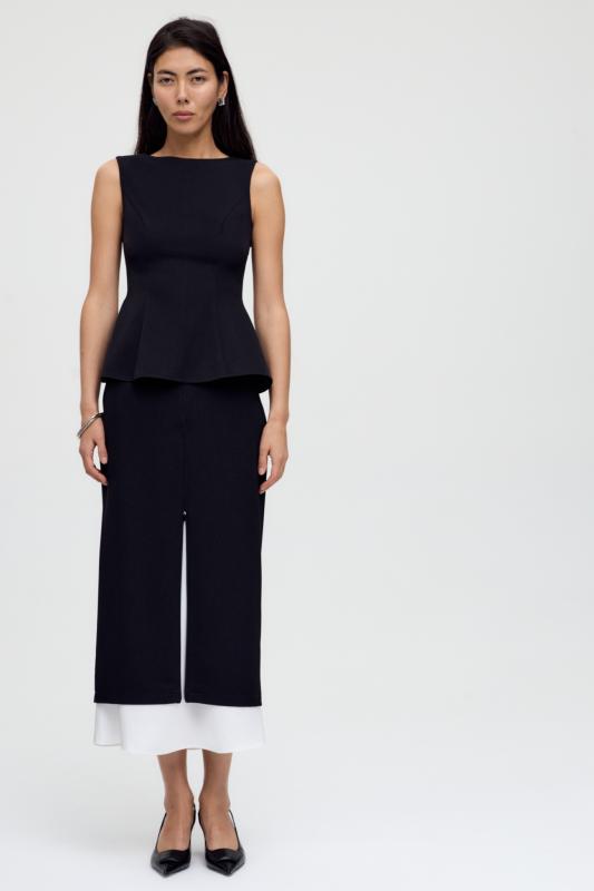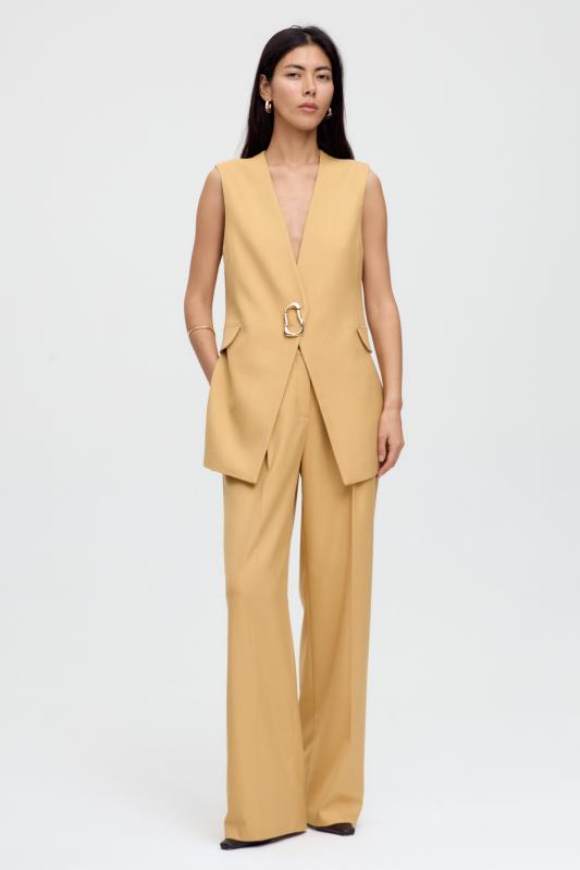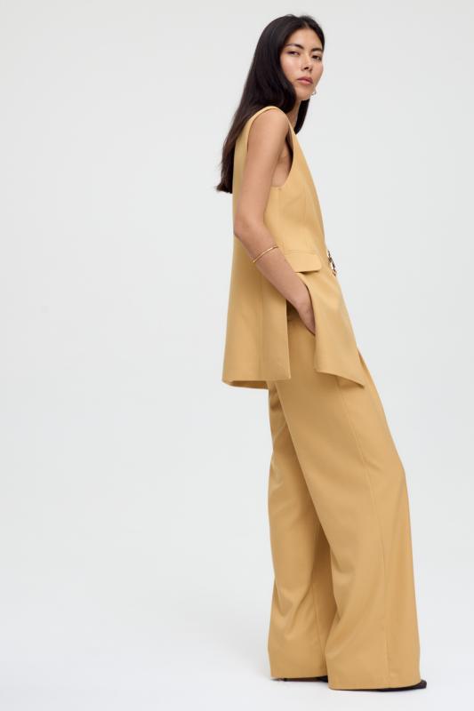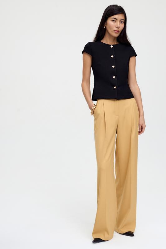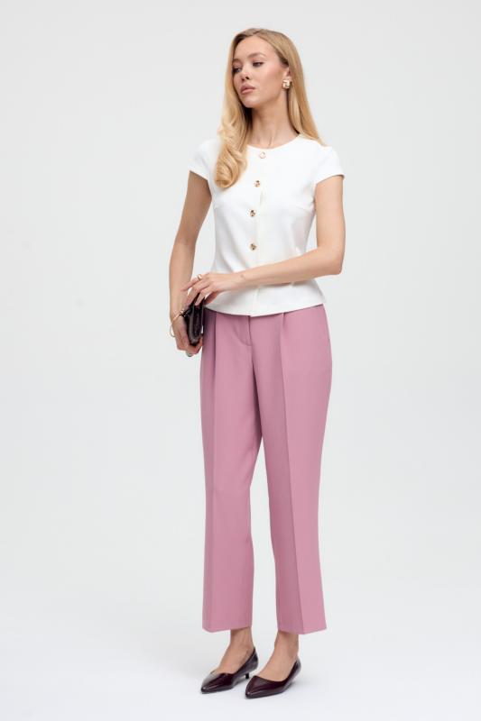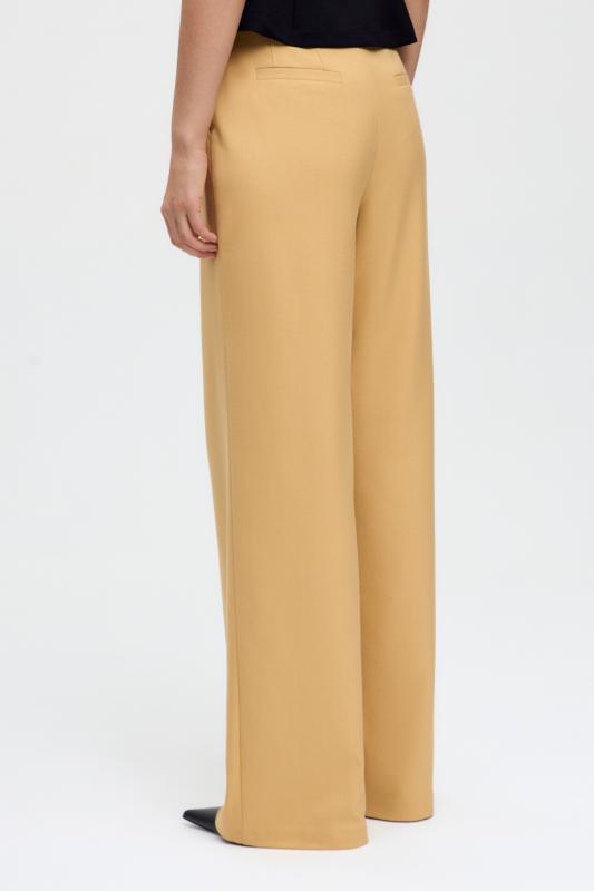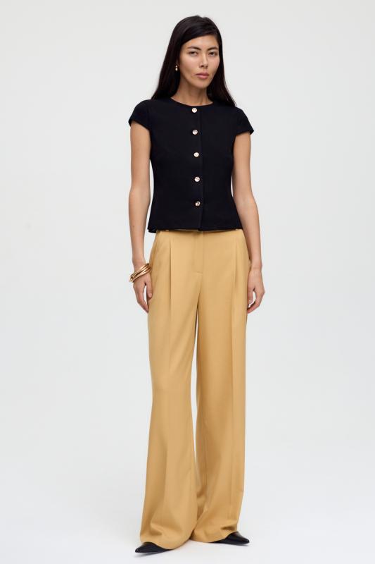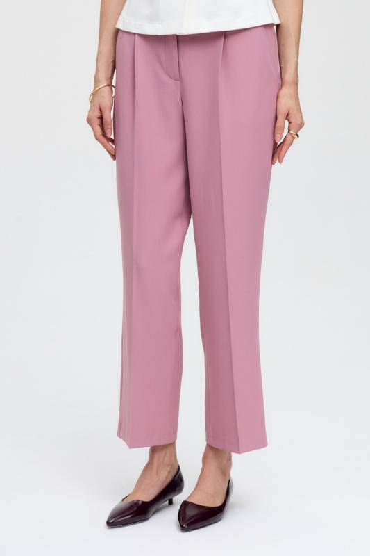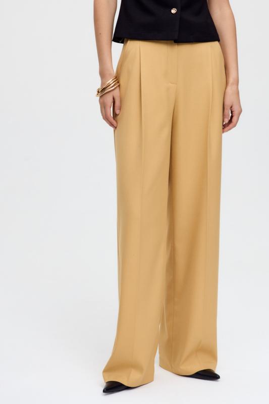 Комфортные брюки из костюмной поливискозы. Прямые свободные брюки с высокой посадкой и стрелками. Боковые карманы, застежка-гульфик на молнию и пуговицу.