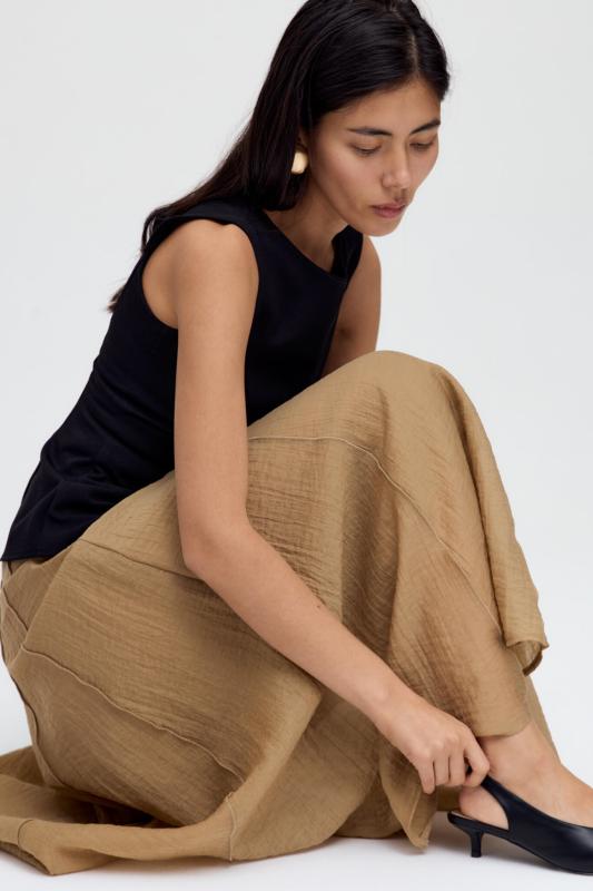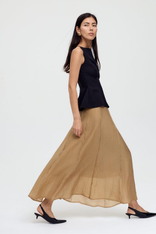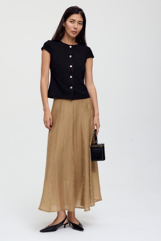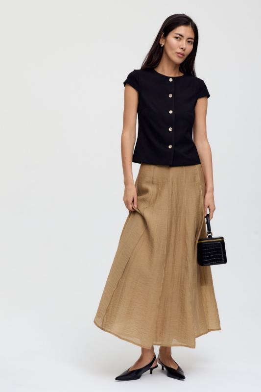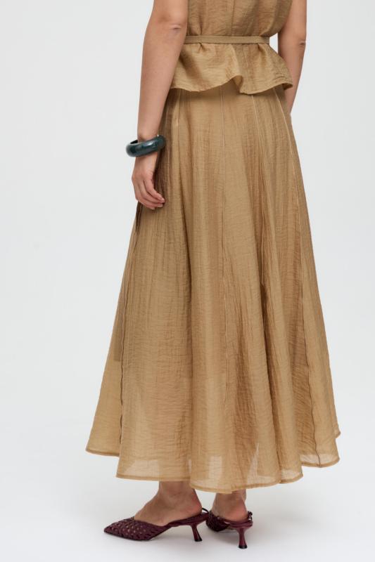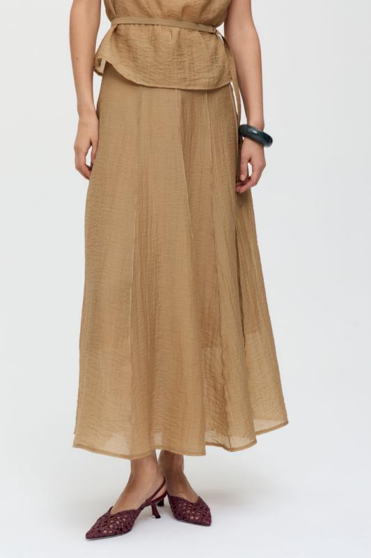 Комфортная юбка из вискозного полотна. Свободная модель с отрезным поясом и резинкой на спинке, юбка на сборке в длине макси. Изделие на подкладке из легкого хлопка.