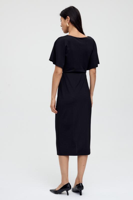 Эффектное платье из трикотажного полотна. Модель полуприлегающего силуэта. Спущенная линия. Отрезная линия талии дополнена баской. По спинке разрез, застёжка на потайную молнию.