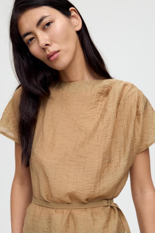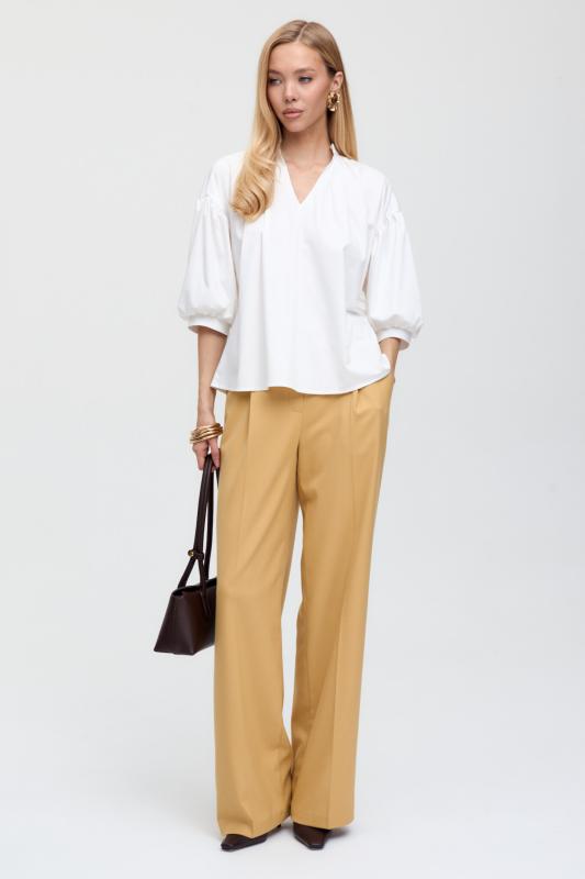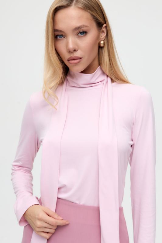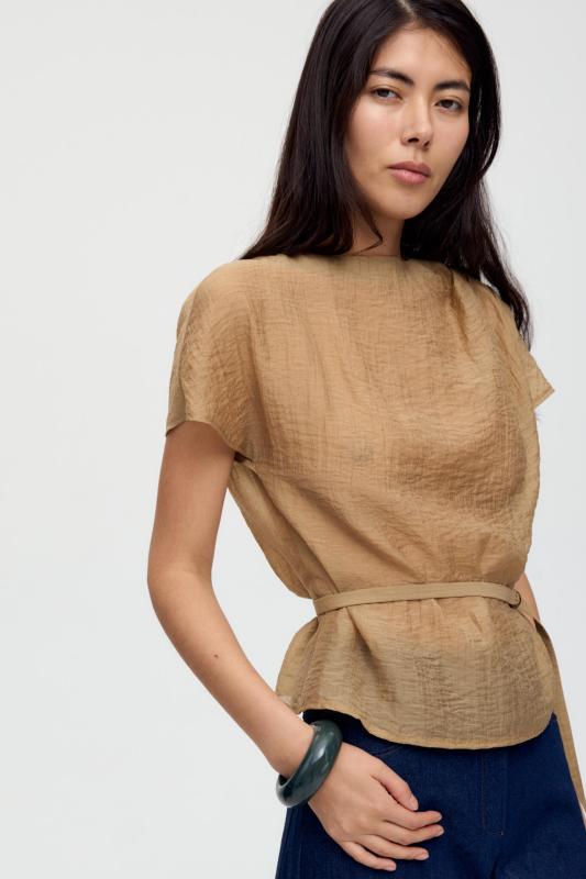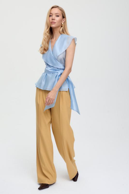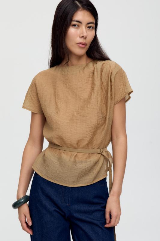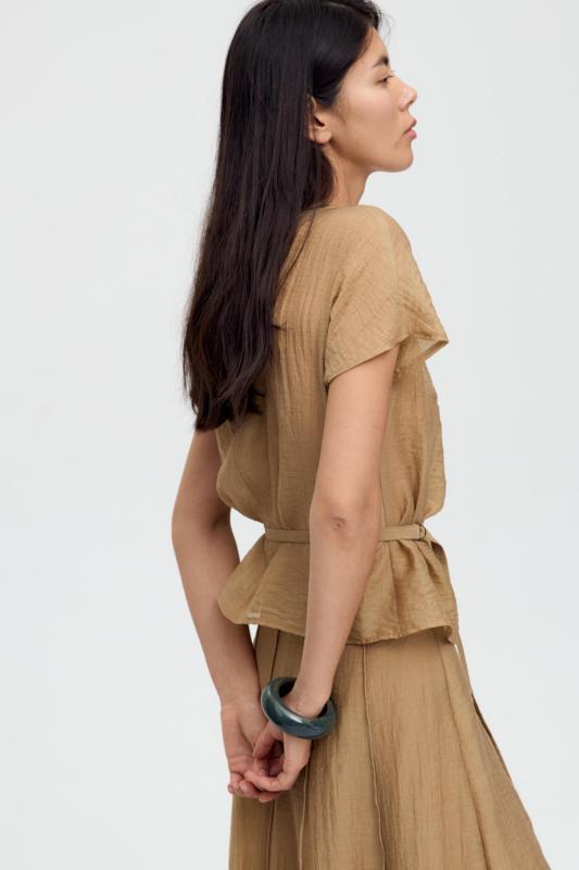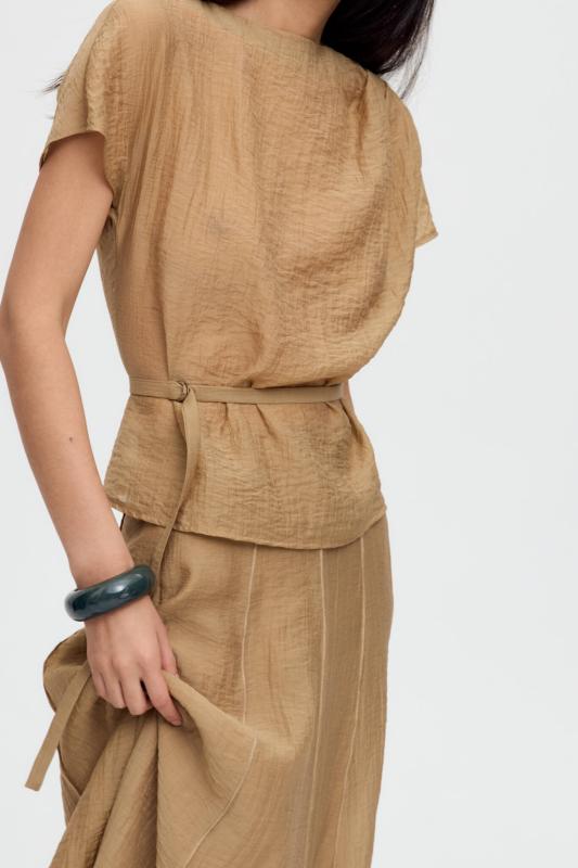 Топ из воздушной вискозы благородного оттенка. Модель свободного силуэта. Горловина оформлена стойкой со сборкой. По спинке застежка на петлю и пуговицу. В комплекте тонкий пояс из основной ткани.