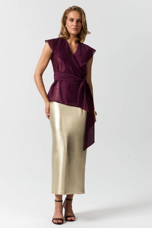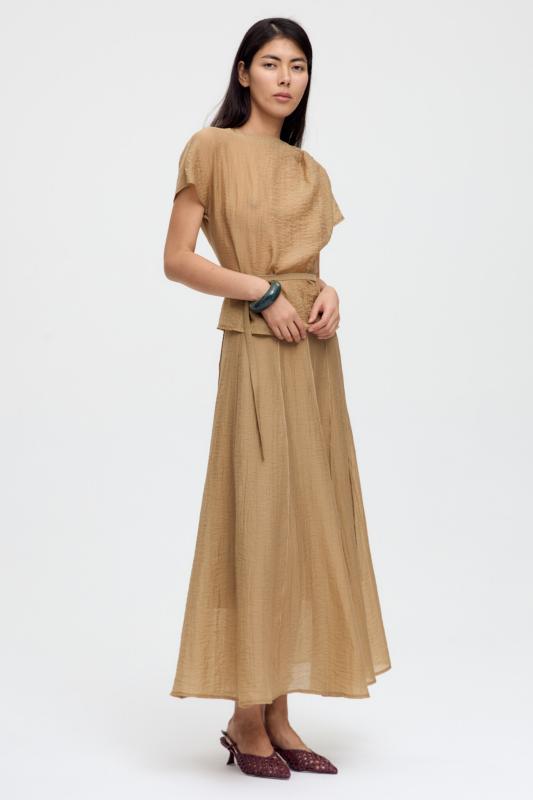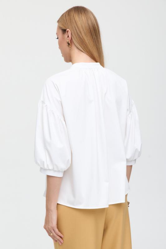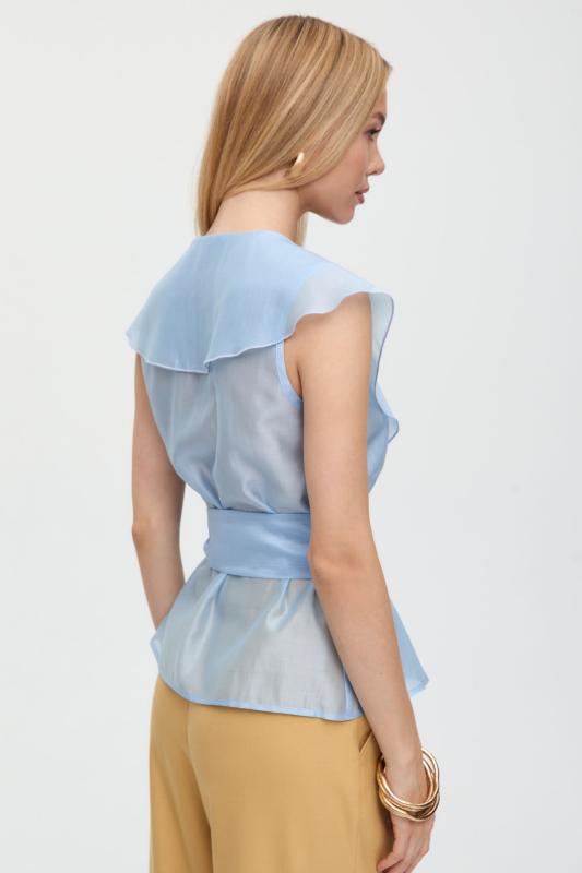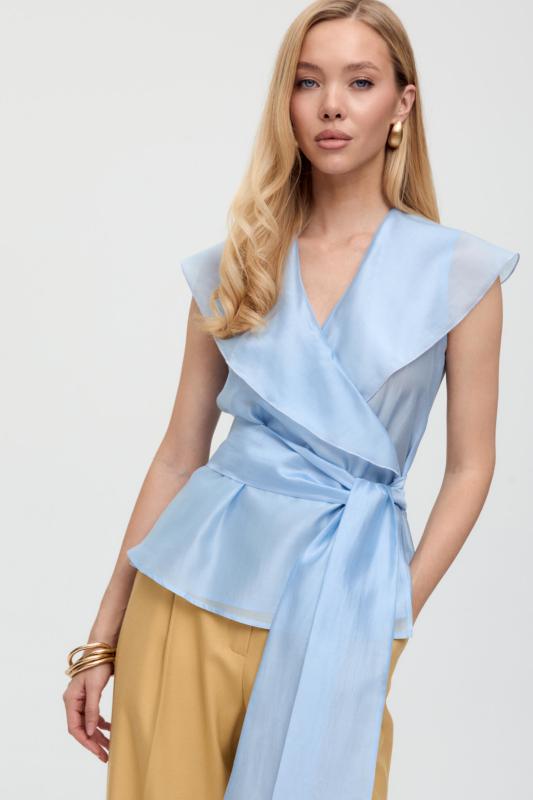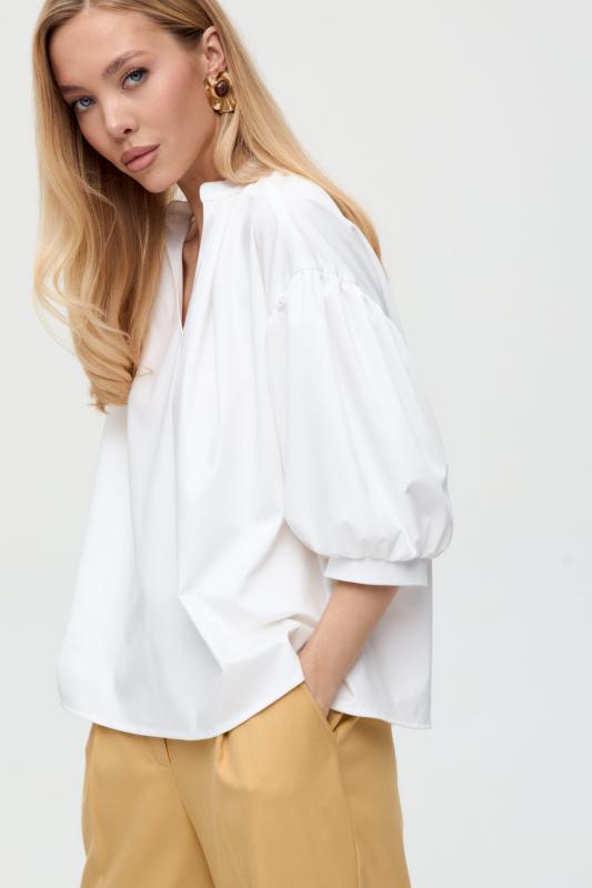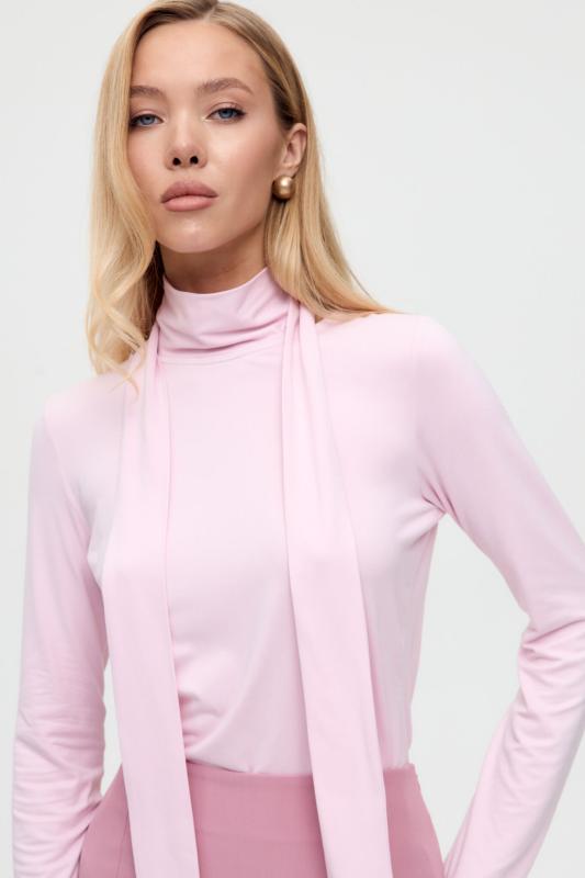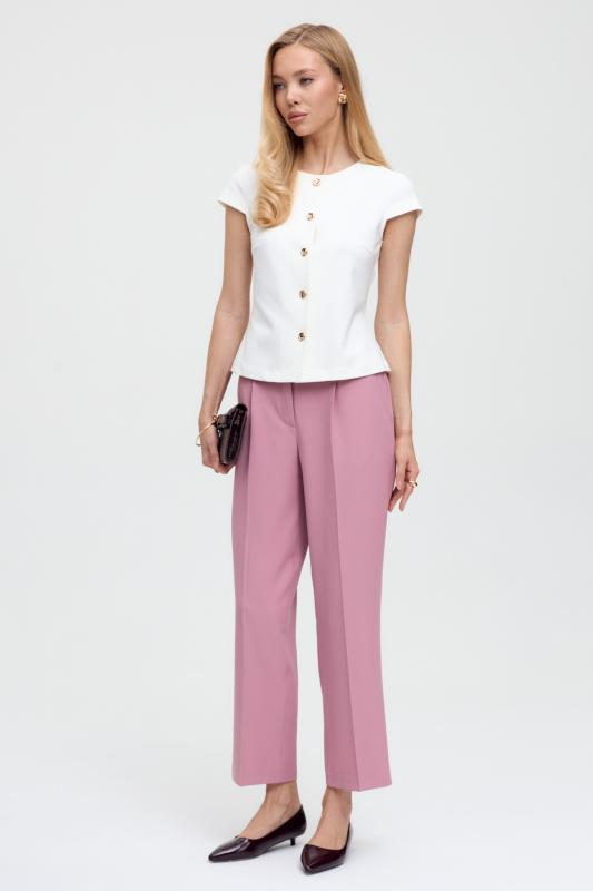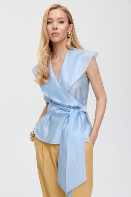Топ из воздушной вискозы благородного оттенка. Модель свободного силуэта. Горловина оформлена стойкой со сборкой. По спинке застежка на петлю и пуговицу. В комплекте тонкий пояс из основной ткани.