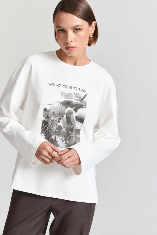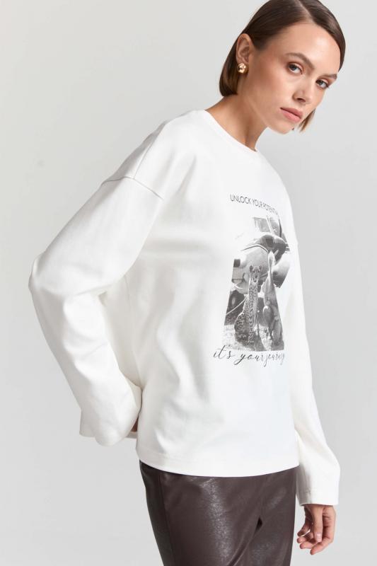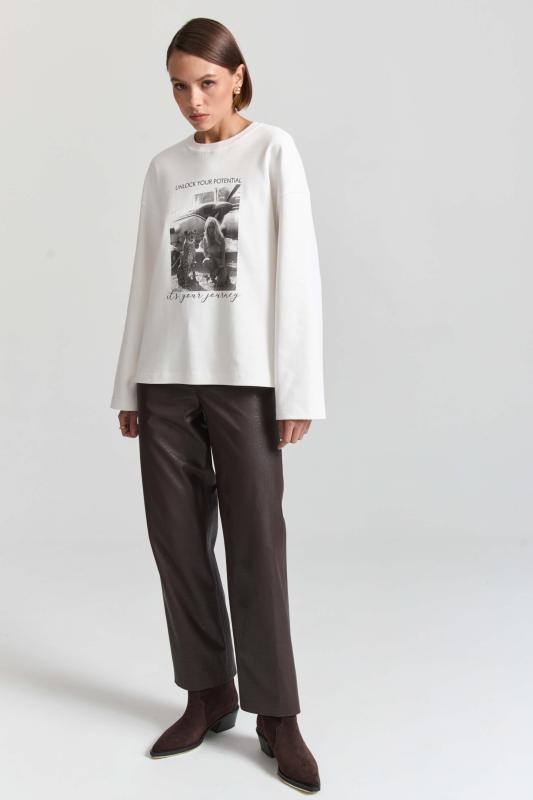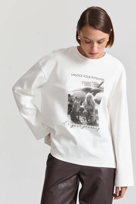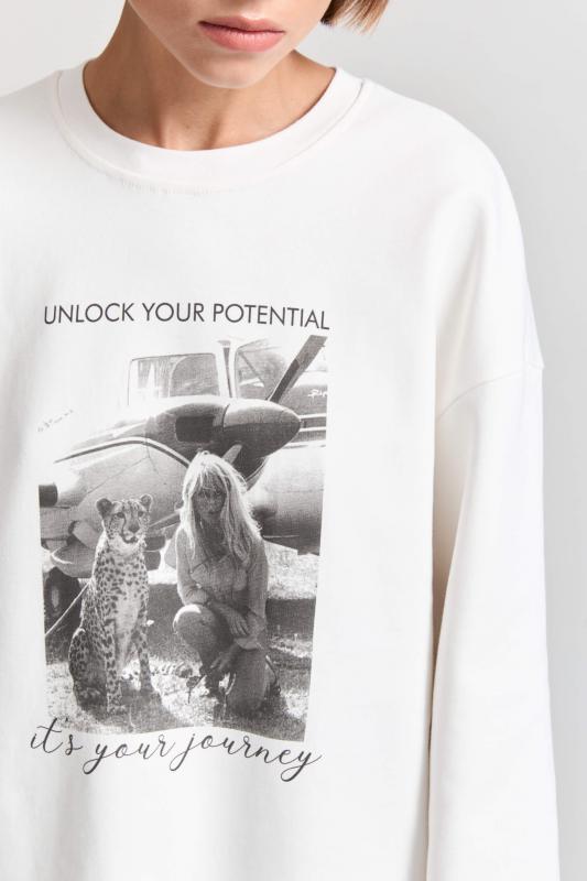 Комфортный лонгслив из материала “интерлок” с авторским принтом. Модель свободного силуэта со спущенной линией плеч. Перевод принта: “Раскройте свой потенциал. Это ваше путешествие.”