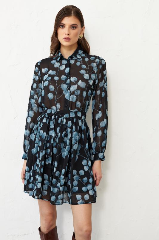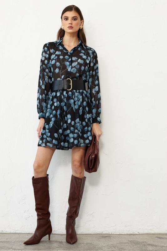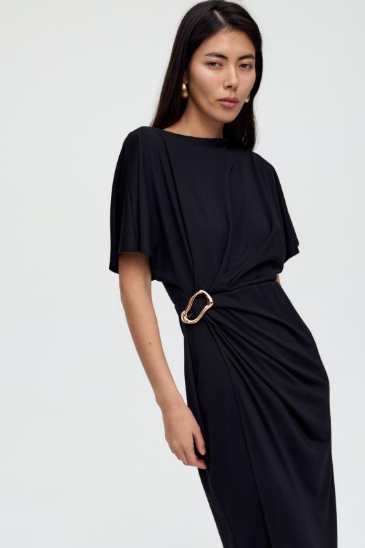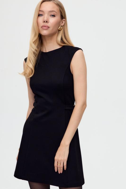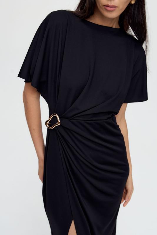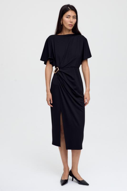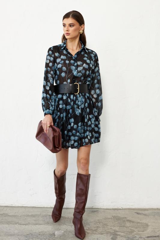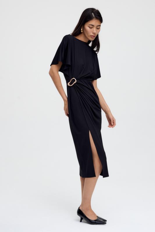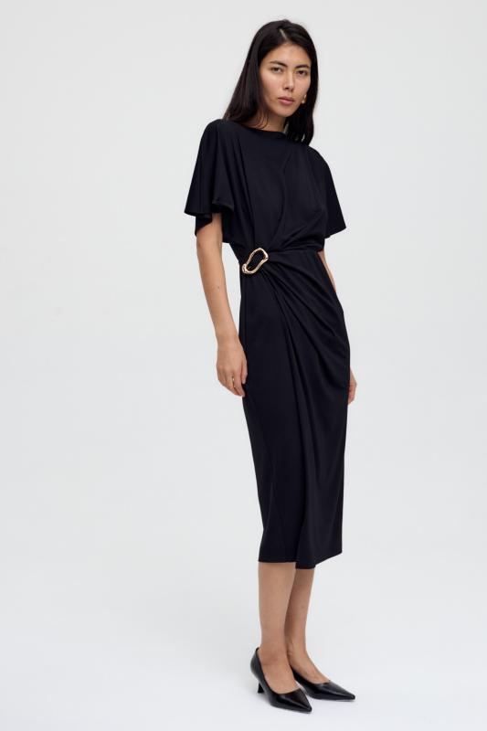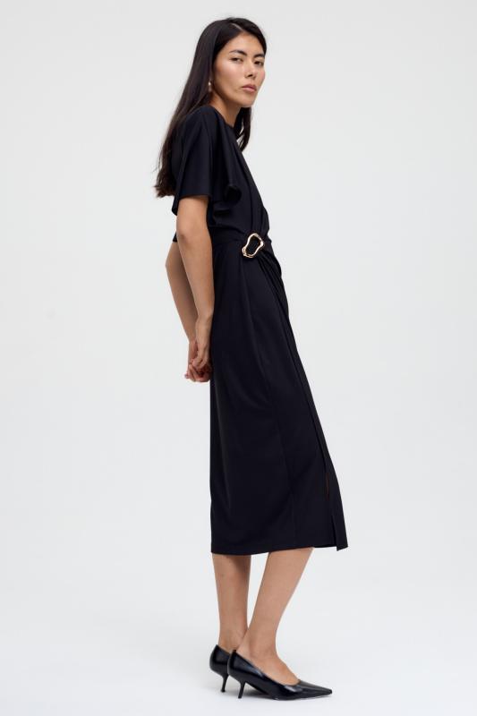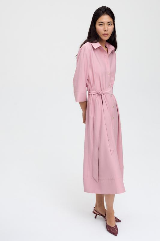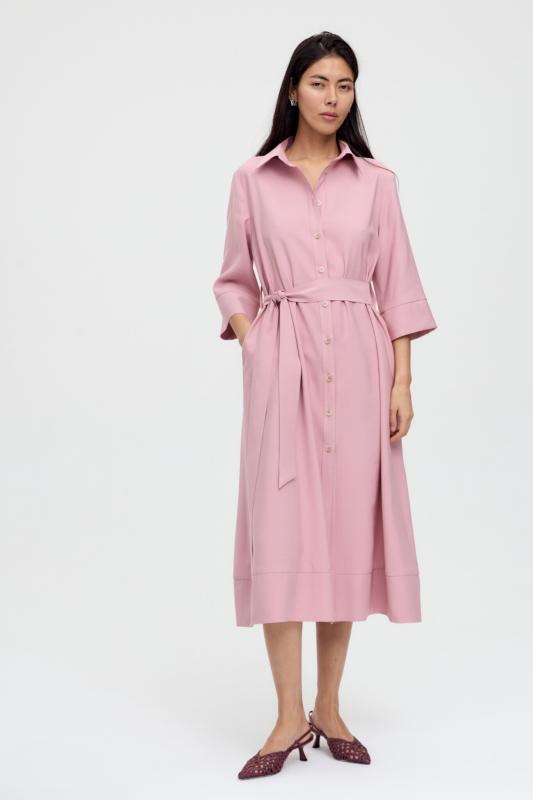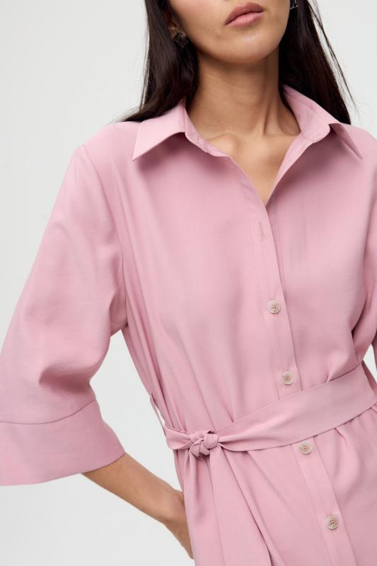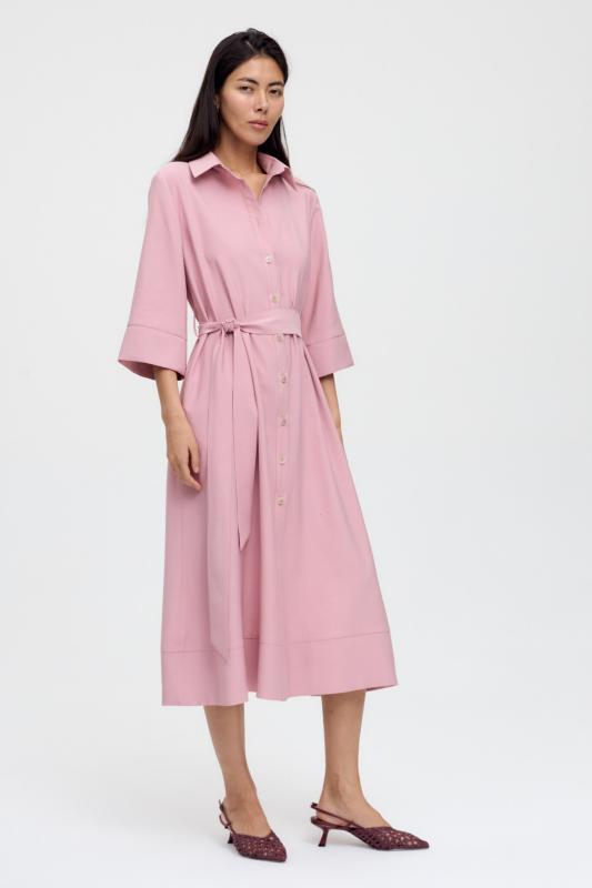 Базовое платье из вискозы тенсель. Модель полуприлегающего силуэта с отрезной линией талии. По переду супатная застежка и акцентная пуговица на стойке. Рукав втачной. В боковом шве потайная молния. В комплекте пояс из основной ткани с акцентной, металлической пряжкой.