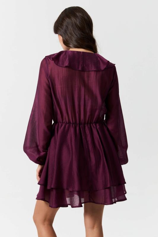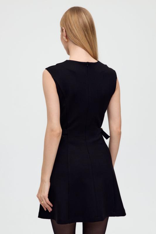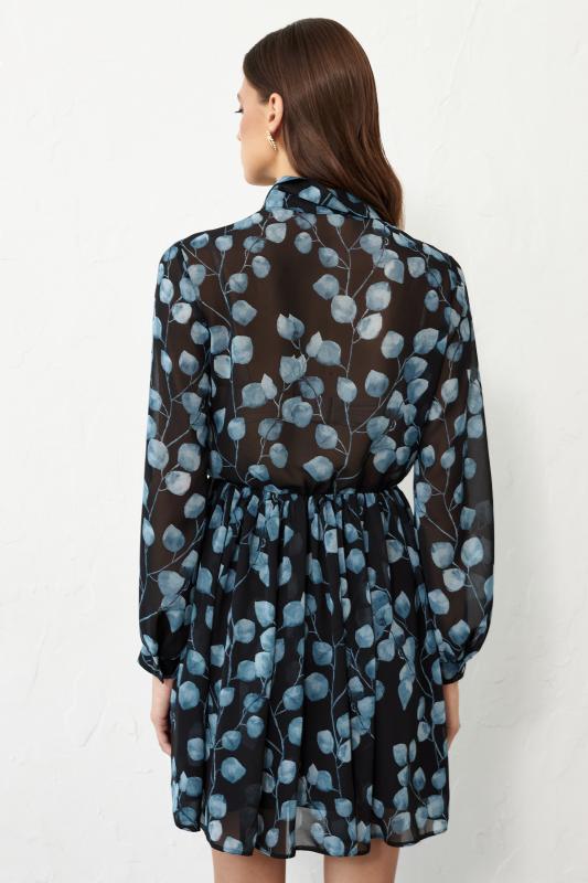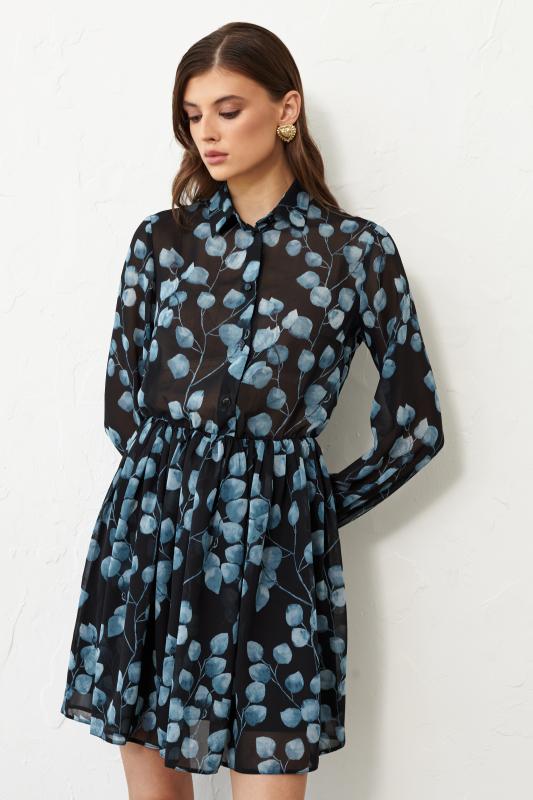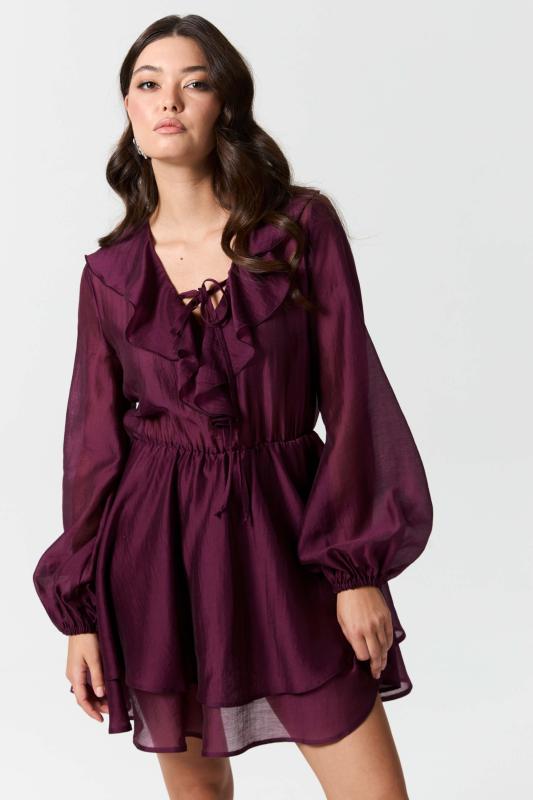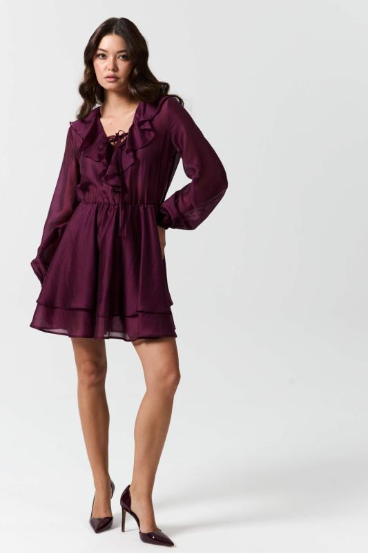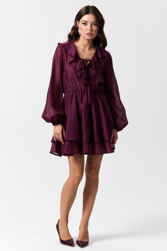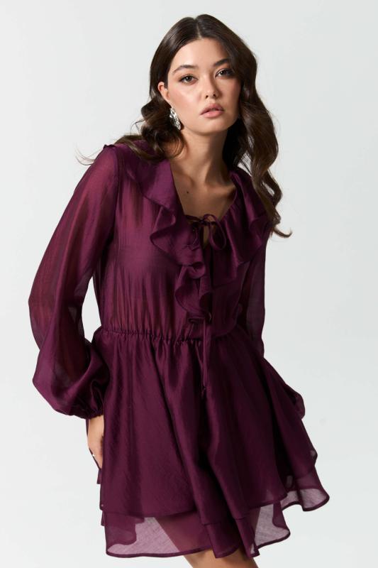 Платье длины мини из вискозной вуали с двойной юбкой. Декоративные рюши и завязки по горловине. Отрезное по талии, юбка на подкладке из основной ткани. Рукав втачной, расширенный к низу на резинке.